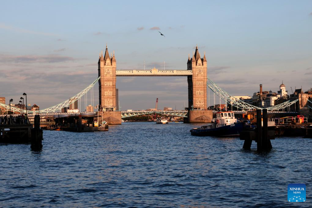 Tower Bridge is seen as the sun sets in London, Britain, Aug. 2, 2025. (Photo by Wang Muhan/Xinhua)