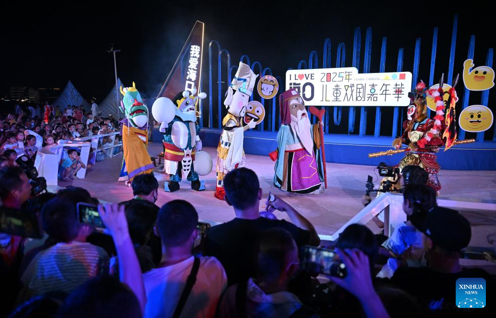 People watch a drama at the opening ceremony of the 2025 (26th) Hainan Island Carnival in Haikou, south China's Hainan Province, Aug. 2, 2025. The 2025 (26th) Hainan Island Carnival kicked off on Saturday here. With various activities arranged across the island, the event will last till Aug. 31. (Xinhua/Guo Cheng)