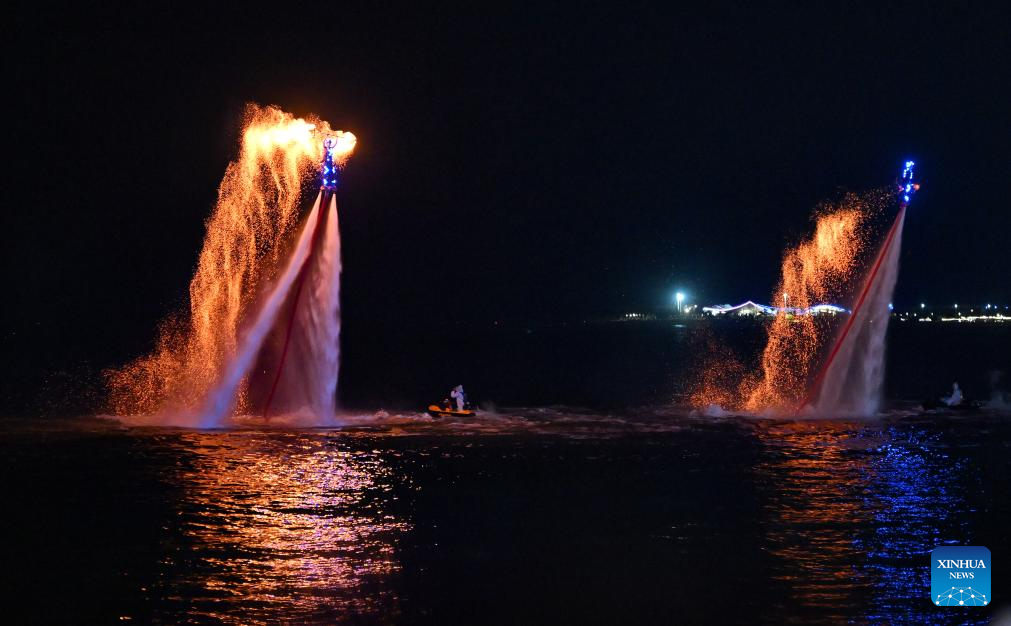 This photo taken on Aug. 2, 2025 shows a performance on the water at the opening ceremony of the 2025 (26th) Hainan Island Carnival in Haikou, south China's Hainan Province. The 2025 (26th) Hainan Island Carnival kicked off on Saturday here. With various activities arranged across the island, the event will last till Aug. 31. (Xinhua/Guo Cheng)