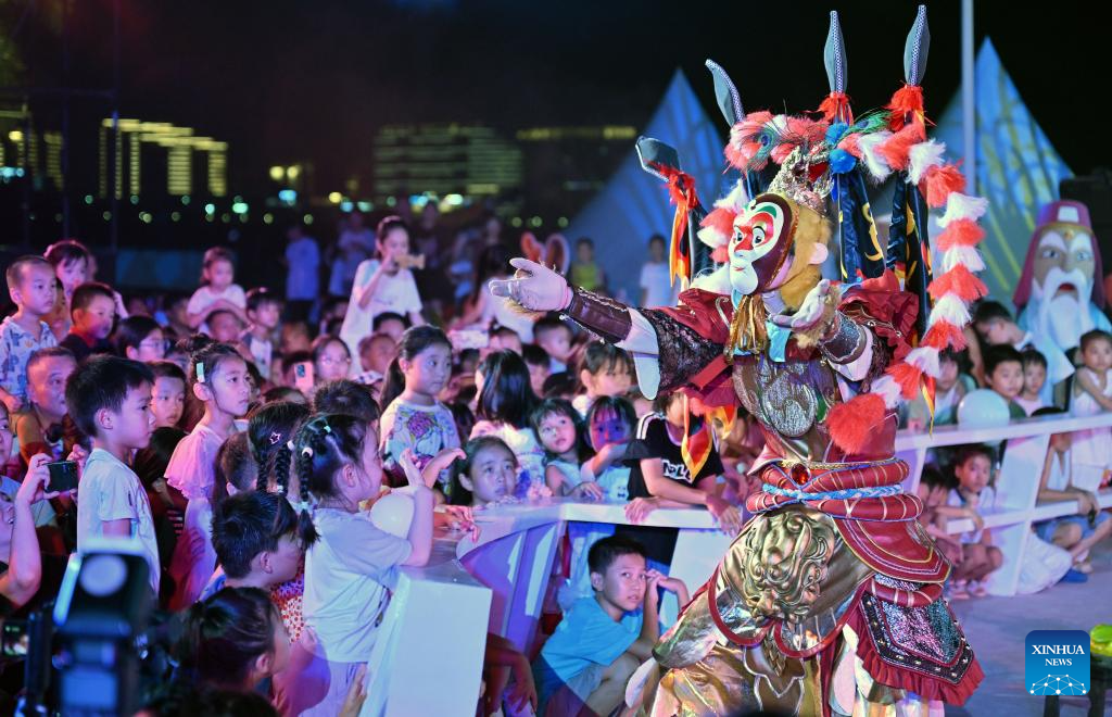 A performer interacts with kids at the opening ceremony of the 2025 (26th) Hainan Island Carnival in Haikou, south China's Hainan Province, Aug. 2, 2025. The 2025 (26th) Hainan Island Carnival kicked off on Saturday here. With various activities arranged across the island, the event will last till Aug. 31. (Xinhua/Guo Cheng)