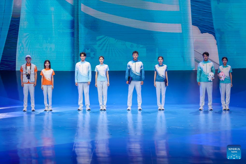 Photo taken on Aug. 2, 2025 shows the event uniforms for China's 15th National Games and 12th National Paralympic Games, along with the 9th National Special Olympics Games in Shenzhen, south China's Guangdong Province. (Xinhua/Liang Xu)