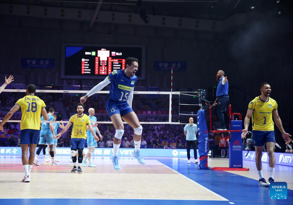 Maique Reis Nascimento (C) of Brazil celebrates during the 3rd place match between Slovenia and Brazil at the 2025 Volleyball Nations League (VNL) Men's Final Round in Ningbo, east China's Zhejiang Province, Aug. 3, 2025. (Photo by Suo Xianglu/Xinhua)