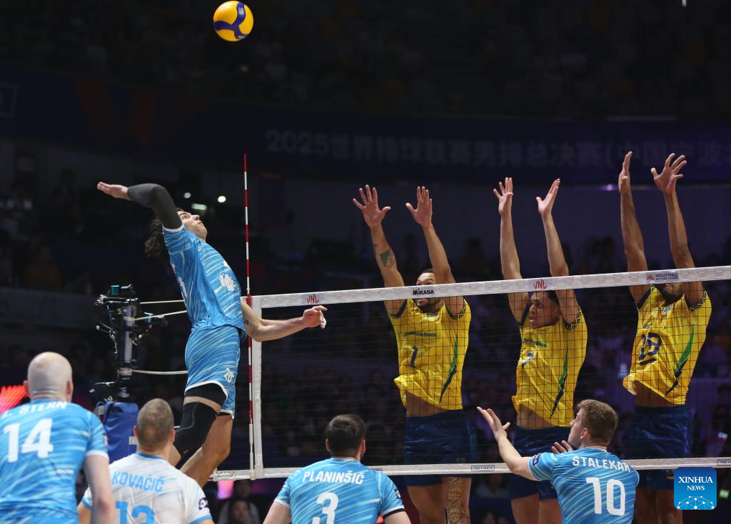 Mujanovic (Top L) of Slovenia spikes the ball during the 3rd place match between Slovenia and Brazil at the 2025 Volleyball Nations League (VNL) Men's Final Round in Ningbo, east China's Zhejiang Province, Aug. 3, 2025. (Photo by Suo Xianglu/Xinhua)