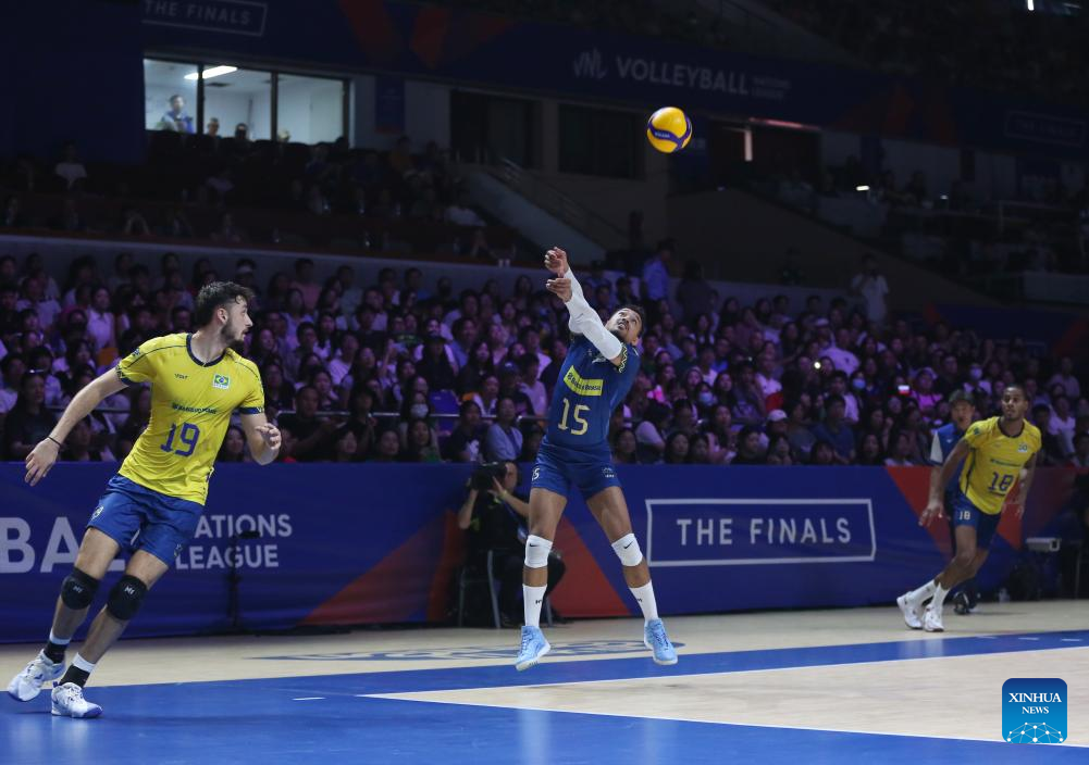 Maique Reis Nascimento (C) of Brazil competes during the 3rd place match between Slovenia and Brazil at the 2025 Volleyball Nations League (VNL) Men's Final Round in Ningbo, east China's Zhejiang Province, Aug. 3, 2025. (Photo by Suo Xianglu/Xinhua)