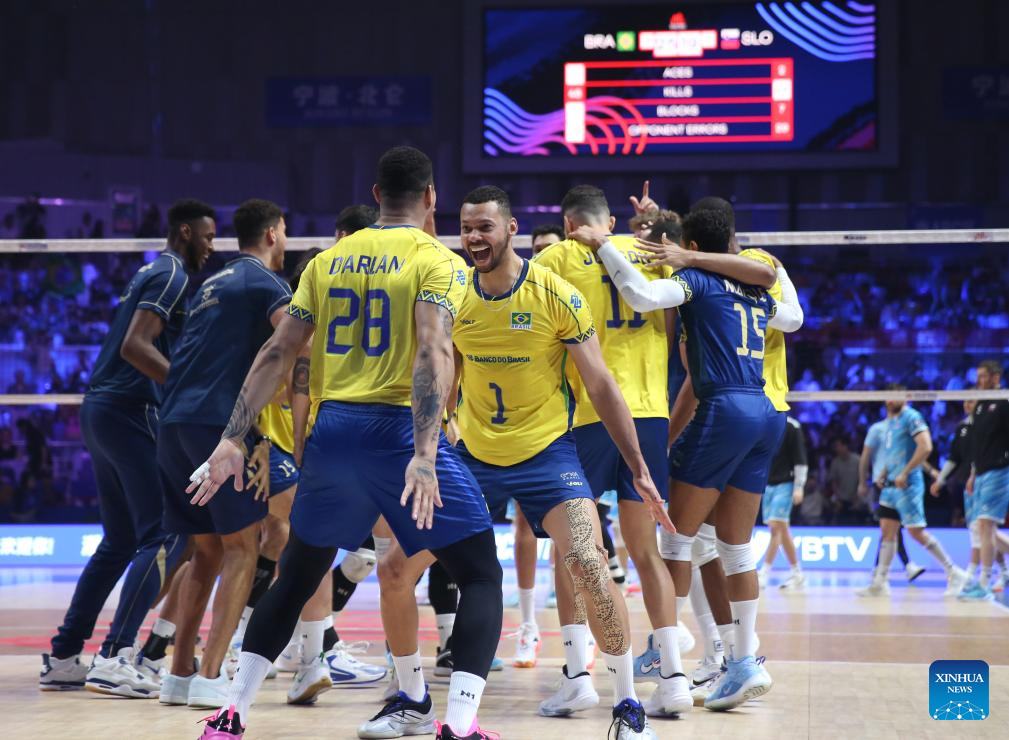 Players of Brazil celebrate during the 3rd place match between Slovenia and Brazil at the 2025 Volleyball Nations League (VNL) Men's Final Round in Ningbo, east China's Zhejiang Province, Aug. 3, 2025. (Photo by Suo Xianglu/Xinhua)