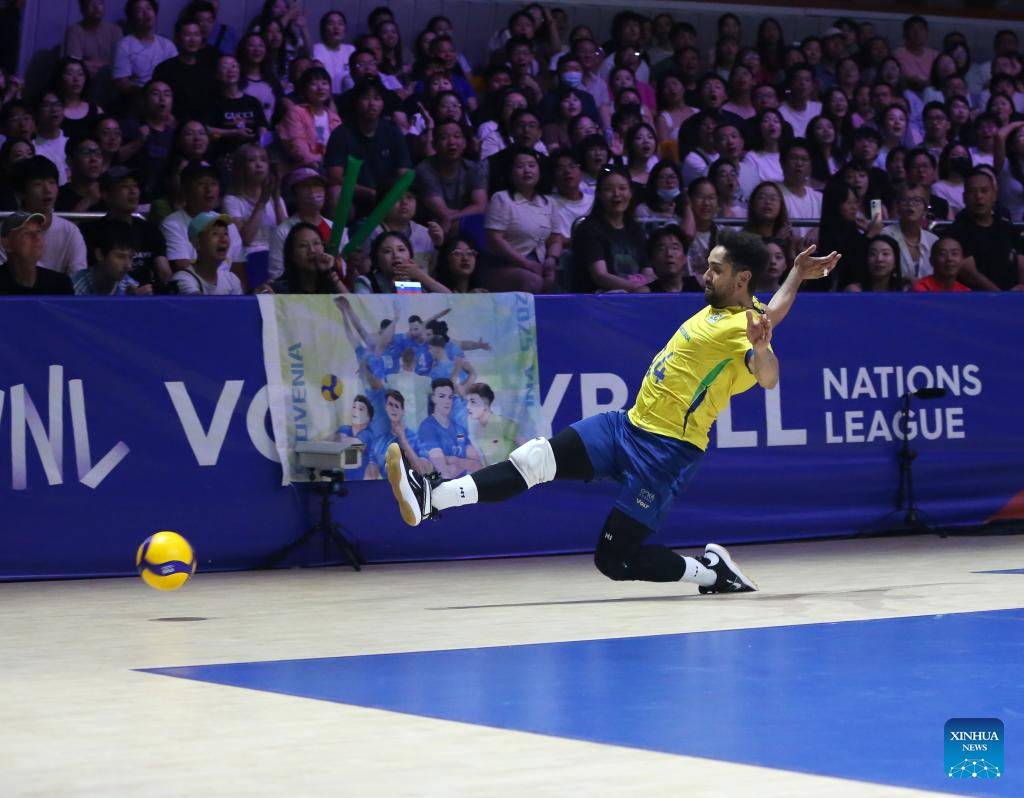 Fernando of Brazil saves the ball during the 3rd place match between Slovenia and Brazil at the 2025 Volleyball Nations League (VNL) Men's Final Round in Ningbo, east China's Zhejiang Province, Aug. 3, 2025. (Photo by Suo Xianglu/Xinhua)