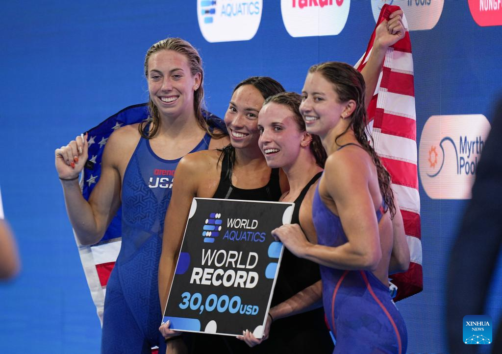SINGAPORE, Aug. 3 (Xinhua) -- The United States brought the World Aquatics Championships to a thrilling close on Sunday by breaking the world record in the women's 4x100 meters medley relay - the final event of the meet.