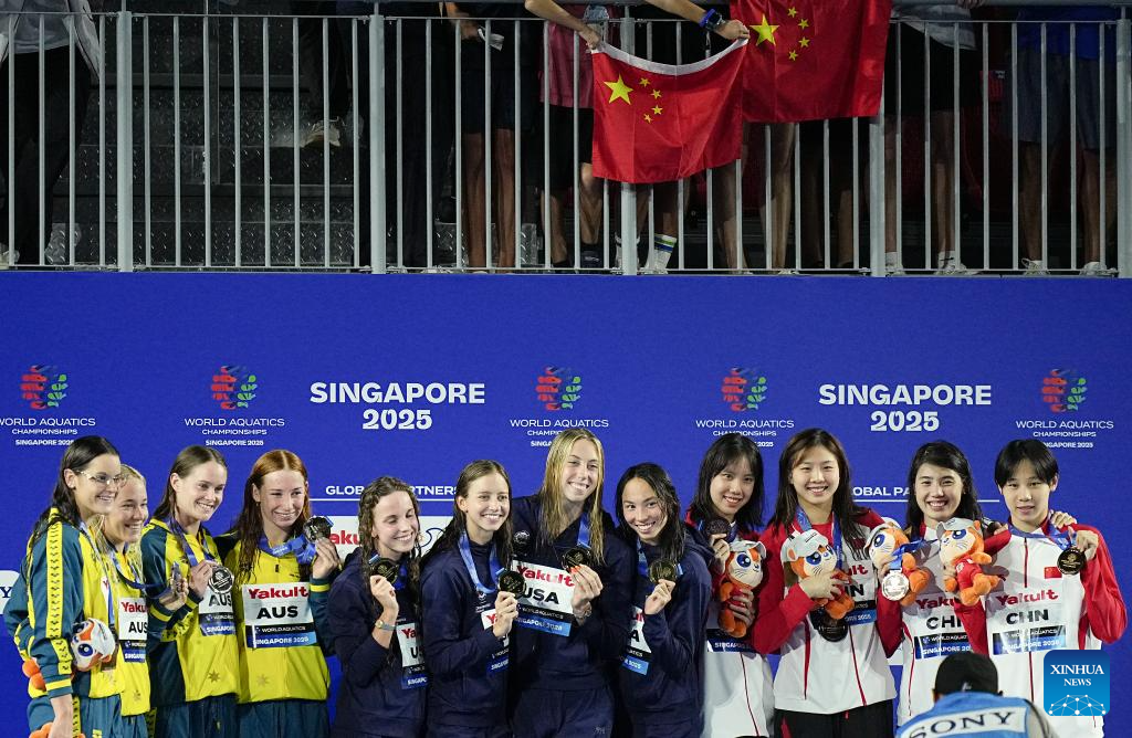Gold medalists Team the United States (C), silver medalists Team Australia (L) and bronze medalists team China pose during the awarding ceremony for the women's 4X100m medley relay final of swimming at the World Aquatics Championships in Singapore, Aug. 3, 2025. (Xinhua/Luo Yuan)