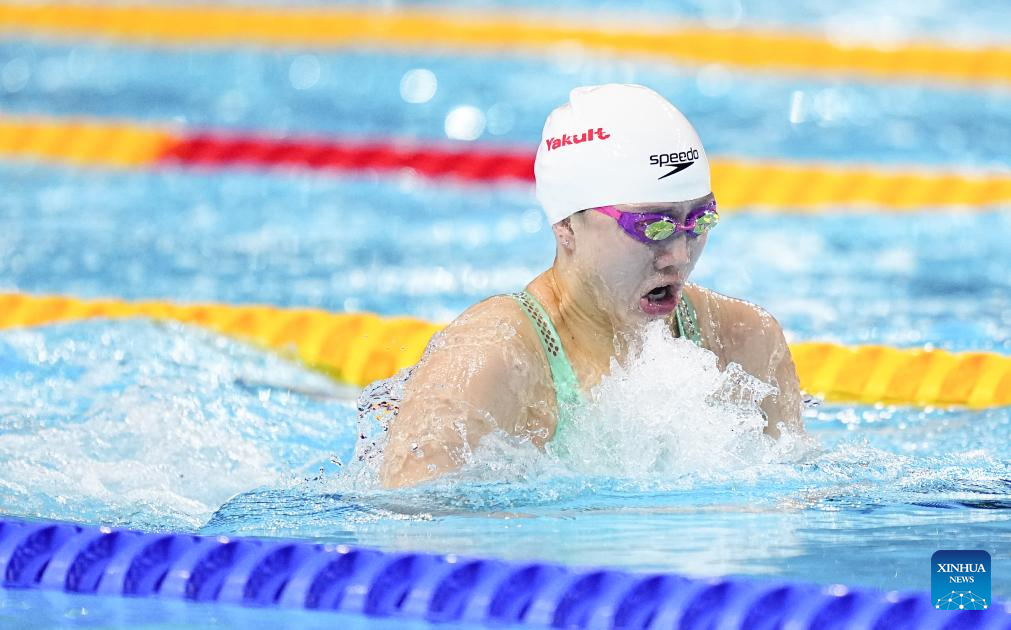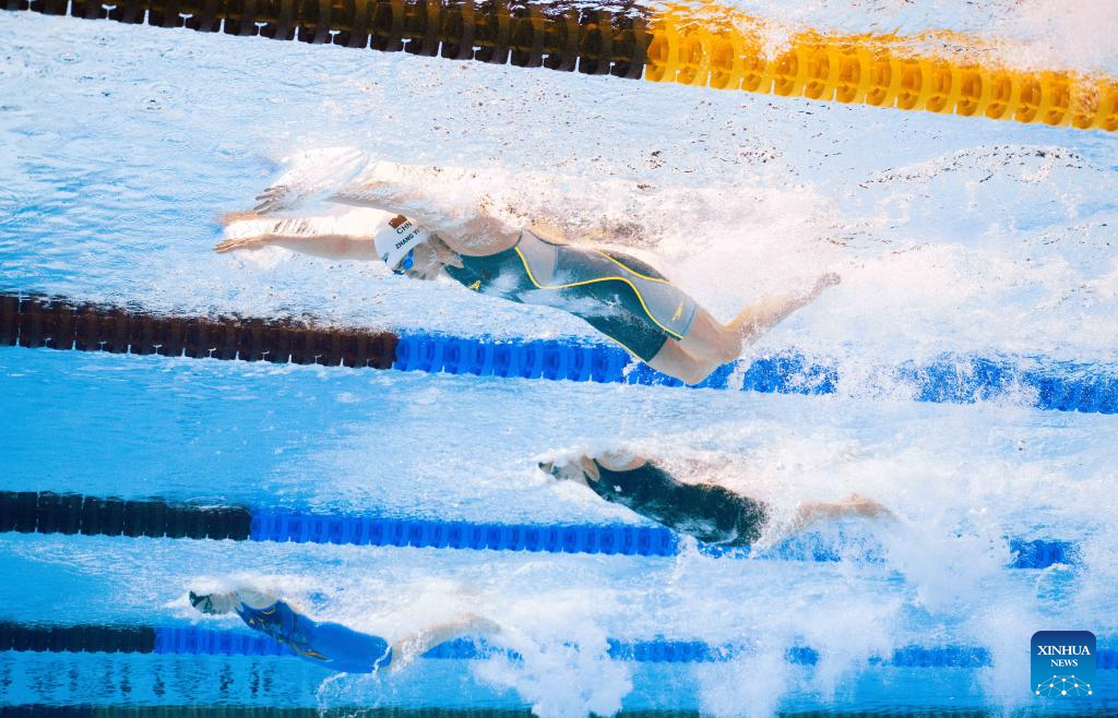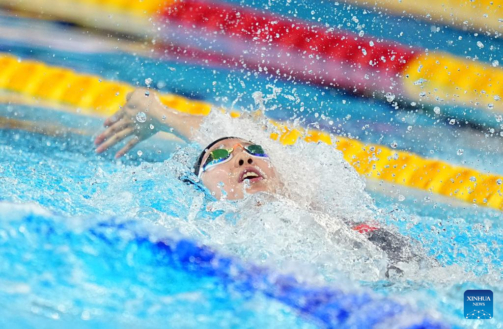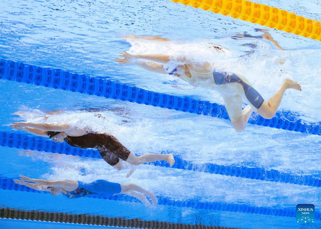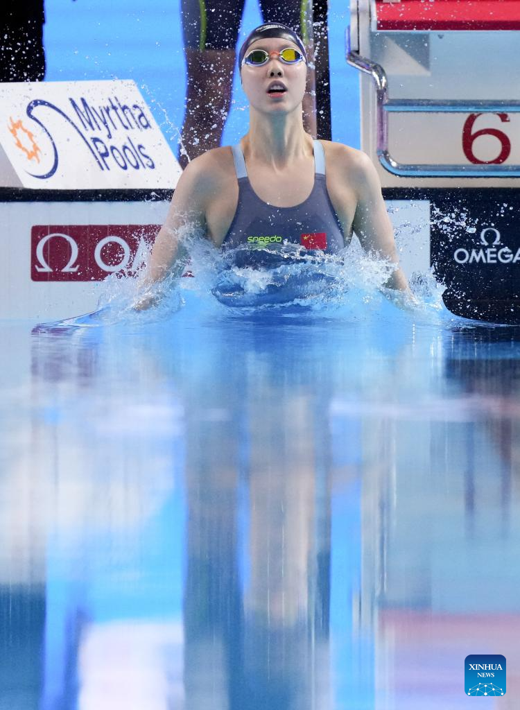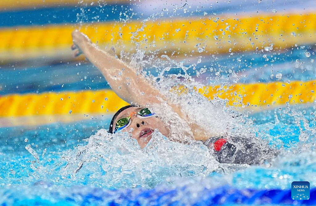 Team China's Tang Qianting competes during the women's 4X100m medley relay final of swimming at the World Aquatics Championships in Singapore, Aug. 3, 2025. (Xinhua/Xia Yifang)