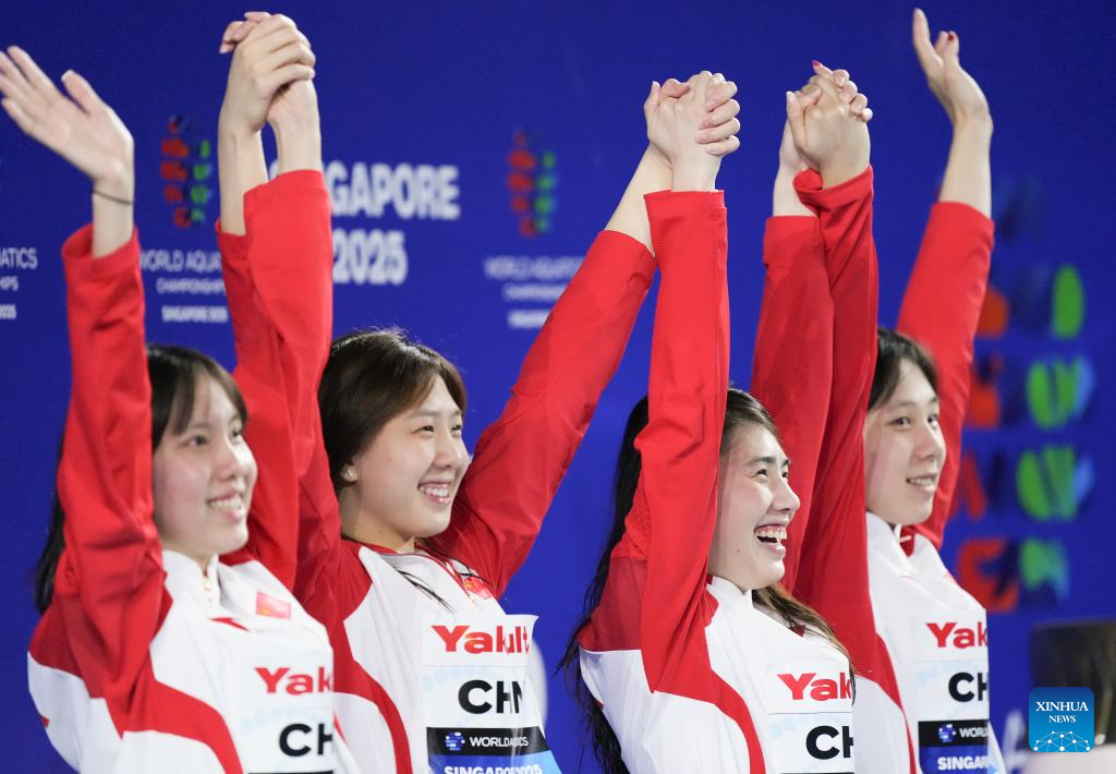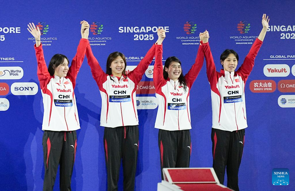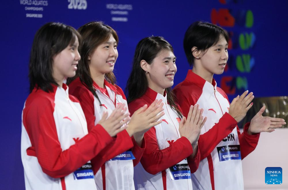 Team China are seen during the awarding ceremony for the women's 4X100m medley relay final of swimming at the World Aquatics Championships in Singapore, Aug. 3, 2025. (Xinhua/Luo Yuan)