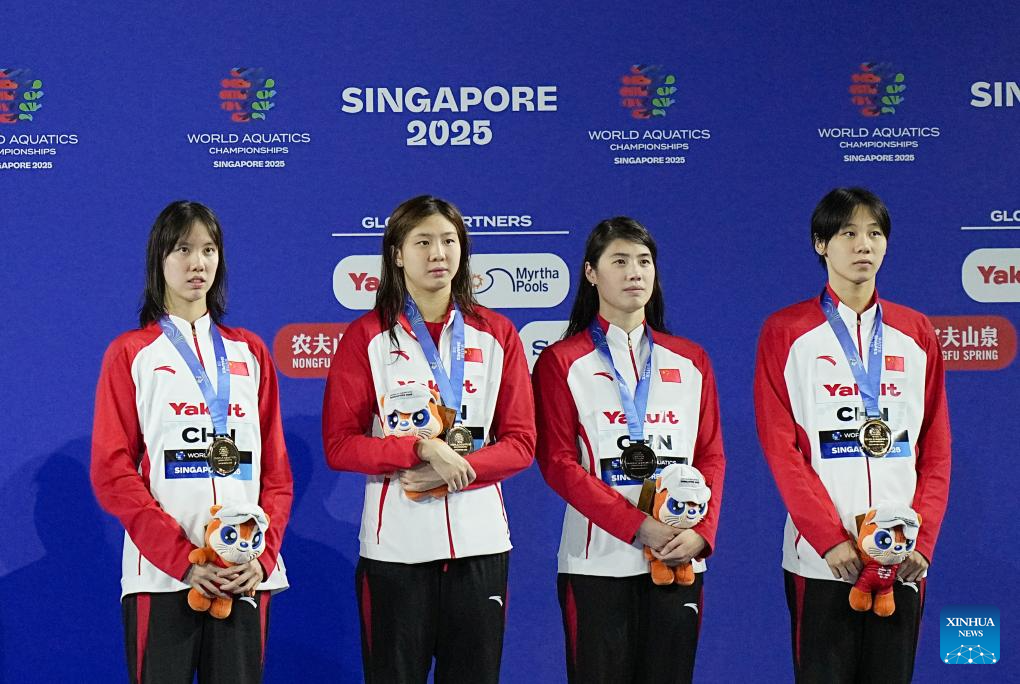 Team China are seen during the awarding ceremony for the women's 4X100m medley relay final of swimming at the World Aquatics Championships in Singapore, Aug. 3, 2025. (Xinhua/Xia Yifang)