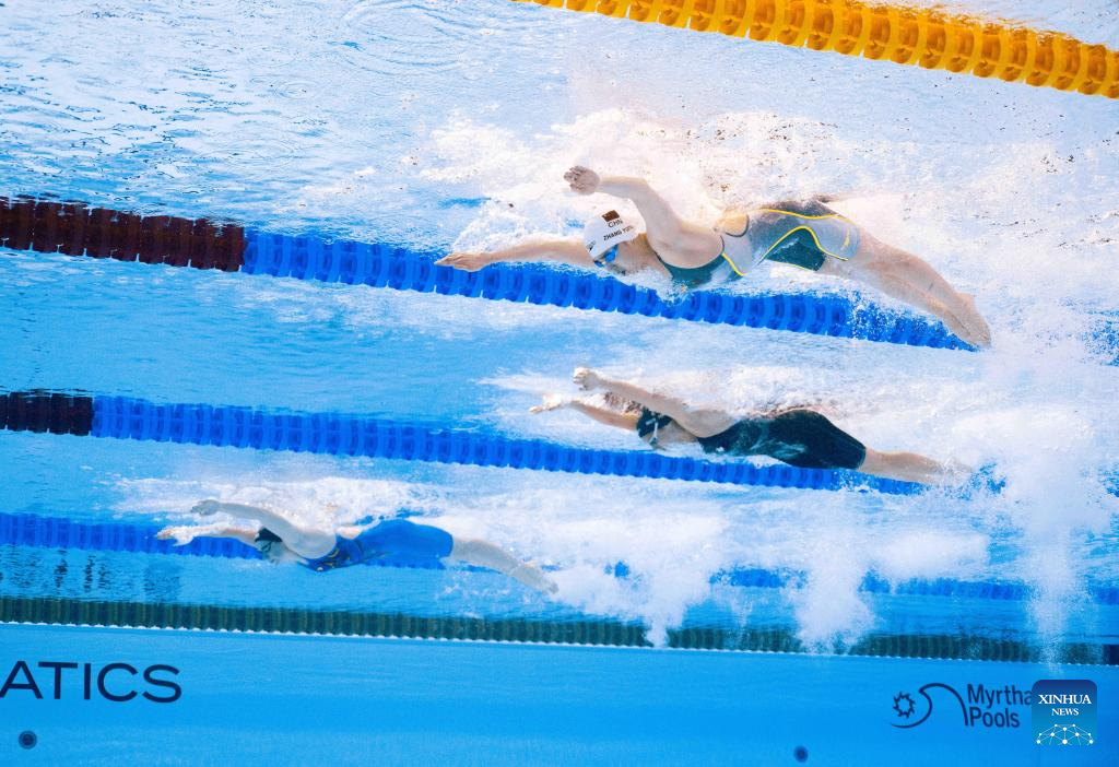 Team China's Zhang Yufei competes during the women's 4X100m medley relay final of swimming at the World Aquatics Championships in Singapore, Aug. 3, 2025. (Xinhua/Luo Yuan)