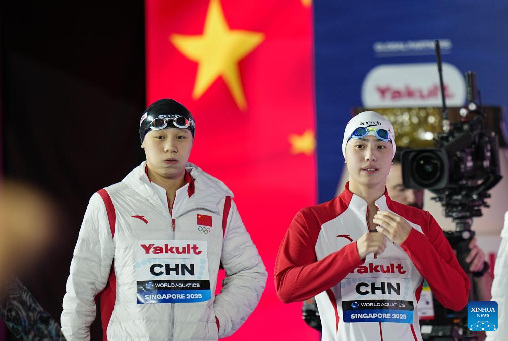 Team China's Zhang Yufei (R) and Cheng Yujie are seen before the women's 4X100m medley relay final of swimming at the World Aquatics Championships in Singapore, Aug. 3, 2025. (Xinhua/Xia Yifang)