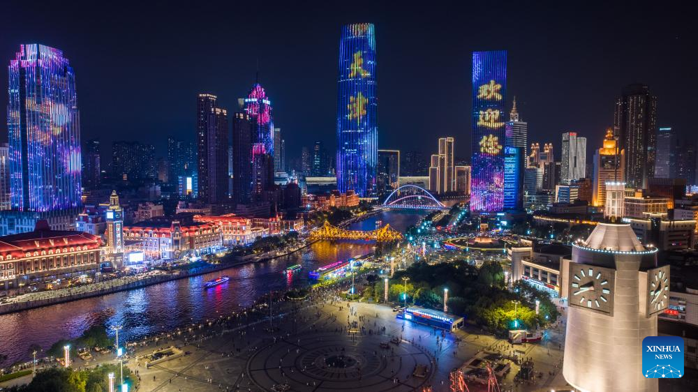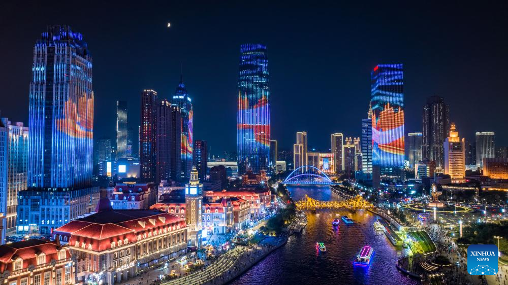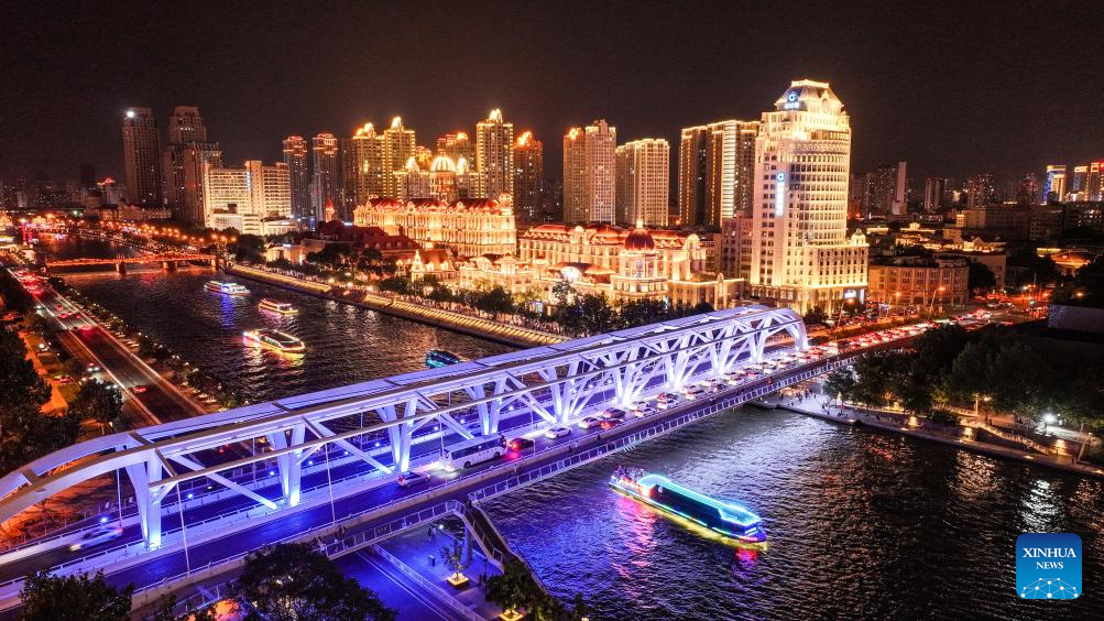 An aerial drone photo taken on Aug. 1, 2025 shows cruise ships sailing on the Haihe River in north China's Tianjin. To improve its urban landscape at night, Tianjin has upgraded the lighting installations for 216 buildings, 13 bridges, 8.2 kilometers of riverbanks and 7 piers along the Haihe River so far in 2025. (Xinhua/Sun Fanyue)