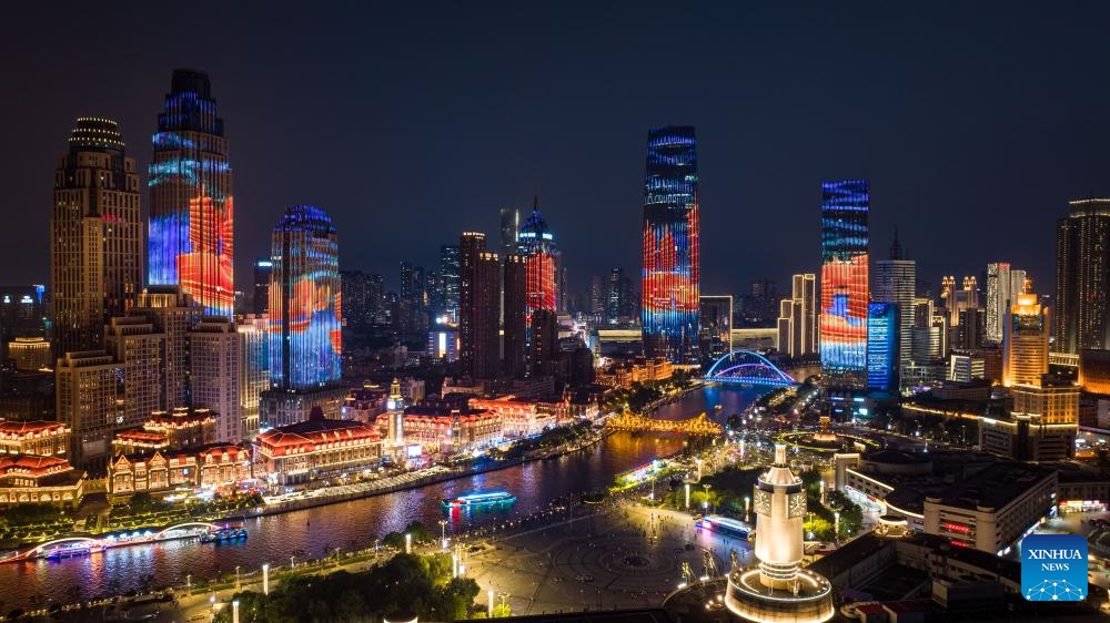 An aerial drone photo taken on Aug. 1, 2025 shows a night view along the Haihe River in north China's Tianjin. To improve its urban landscape at night, Tianjin has upgraded the lighting installations for 216 buildings, 13 bridges, 8.2 kilometers of riverbanks and 7 piers along the Haihe River so far in 2025. (Xinhua/Sun Fanyue)