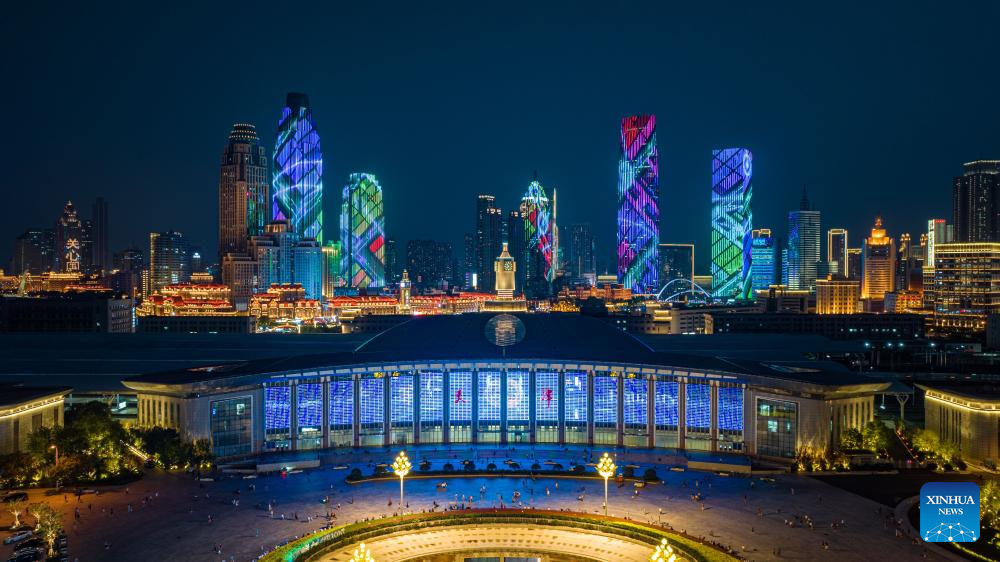 A drone photo taken on Aug. 1, 2025 shows a night view along the Haihe River near the Tianjin Railway Station in north China's Tianjin. To improve its urban landscape at night, Tianjin has upgraded the lighting installations for 216 buildings, 13 bridges, 8.2 kilometers of riverbanks and 7 piers along the Haihe River so far in 2025. (Xinhua/Sun Fanyue)
