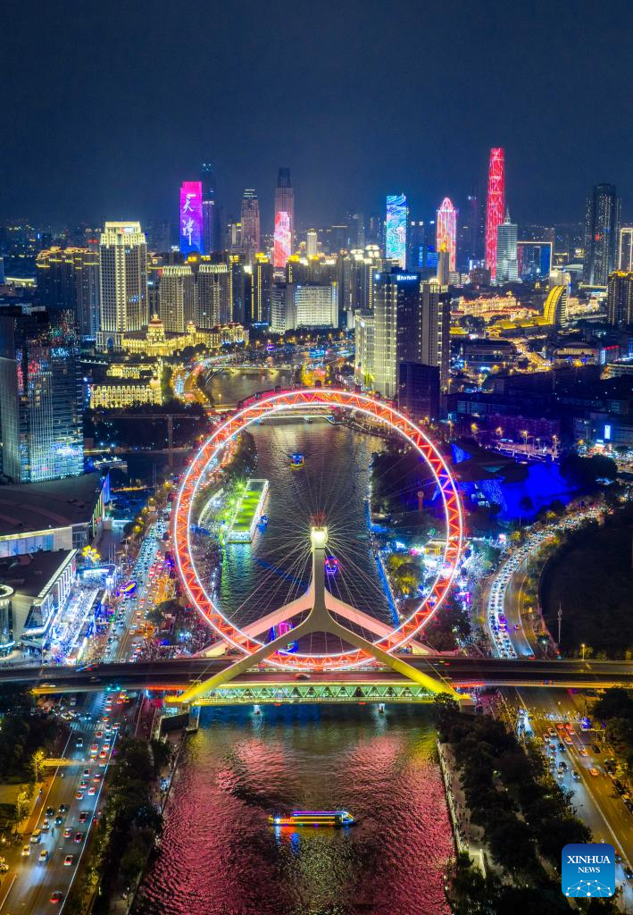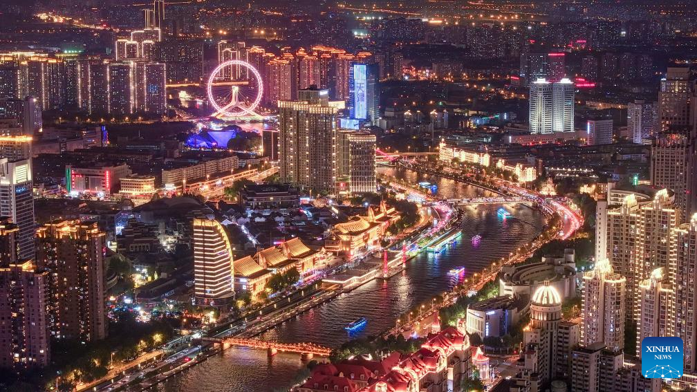 A drone photo taken on July 19, 2025 shows cruise ships sailing on the Haihe River in north China's Tianjin. To improve its urban landscape at night, Tianjin has upgraded the lighting installations for 216 buildings, 13 bridges, 8.2 kilometers of riverbanks and 7 piers along the Haihe River so far in 2025. (Xinhua/Sun Fanyue)