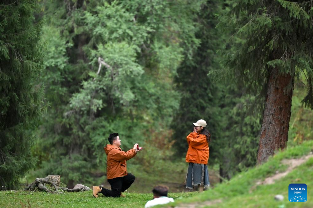 Tourists pose for photos at Koldeneng in Gongliu County of Ili Kazak Autonomous Prefecture, northwest China's Xinjiang Uygur Autonomous Region, on Aug. 2, 2025. (Xinhua/Xin Yuewei)