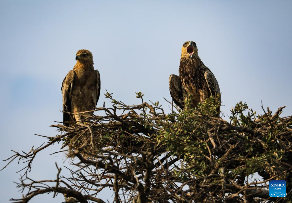 This photo taken on July 29, 2025 shows two eagles in the Masai Mara National Reserve in Kenya. (Xinhua/Han Xu)