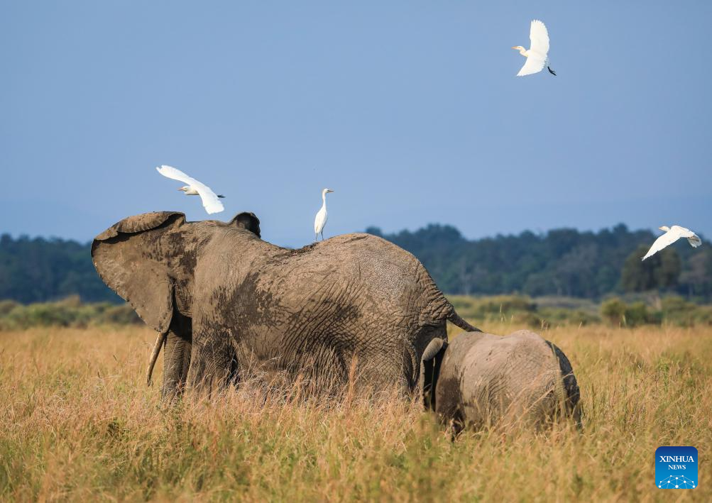 Elephants and birds are seen in the Masai Mara National Reserve in Kenya, on July 30, 2025. (Xinhua/Han Xu)