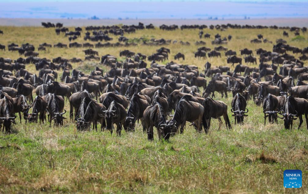 Wildebeests graze on the grassland in the Masai Mara National Reserve in Kenya, on July 31, 2025. (Xinhua/Han Xu)