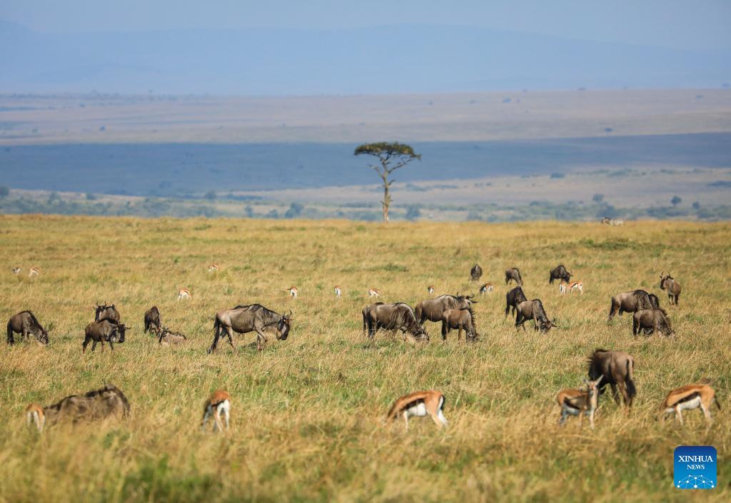 Wildebeests and gazelles are seen in the Masai Mara National Reserve in Kenya, on July 30, 2025. (Xinhua/Han Xu)