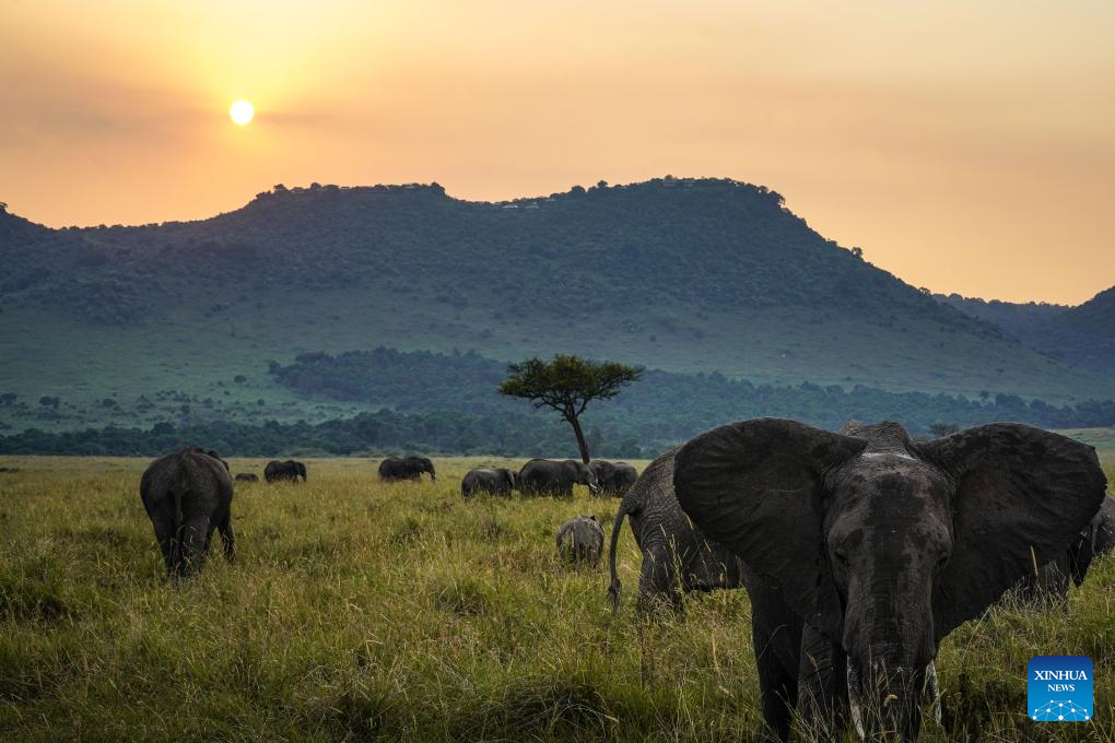 Elephants roam at sunset time in the Masai Mara National Reserve in Kenya, on July 29, 2025. (Xinhua/Han Xu)