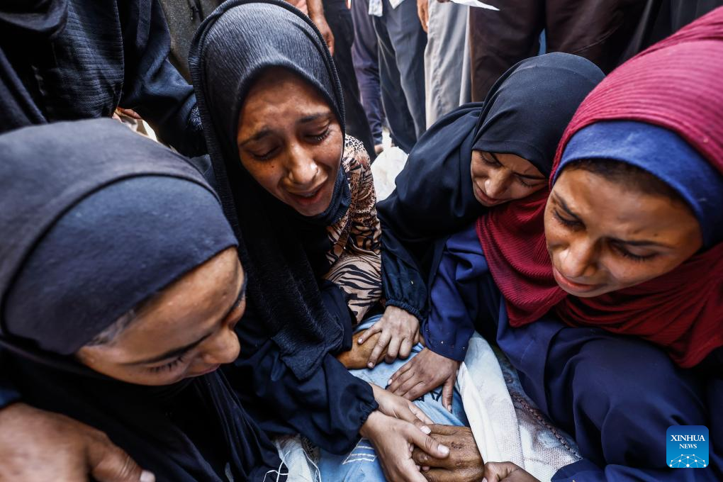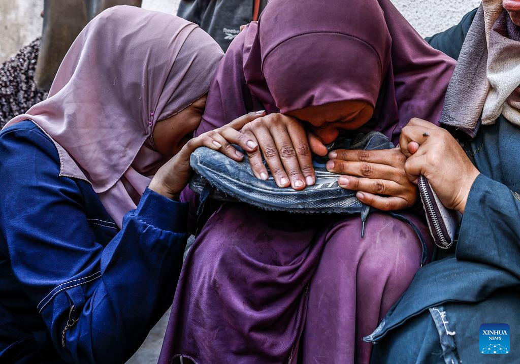 Palestinians mourn for a victim killed in an Israeli airstrike, at a hospital in Gaza City, on Aug. 4, 2025. A total of 35 Palestinians were killed on Monday in Israeli shelling and gunfire across Gaza, at least 12 of those while waiting for humanitarian aid, according to the Gaza Civil Defense. (Photo by Mahmoud Zaki/Xinhua)