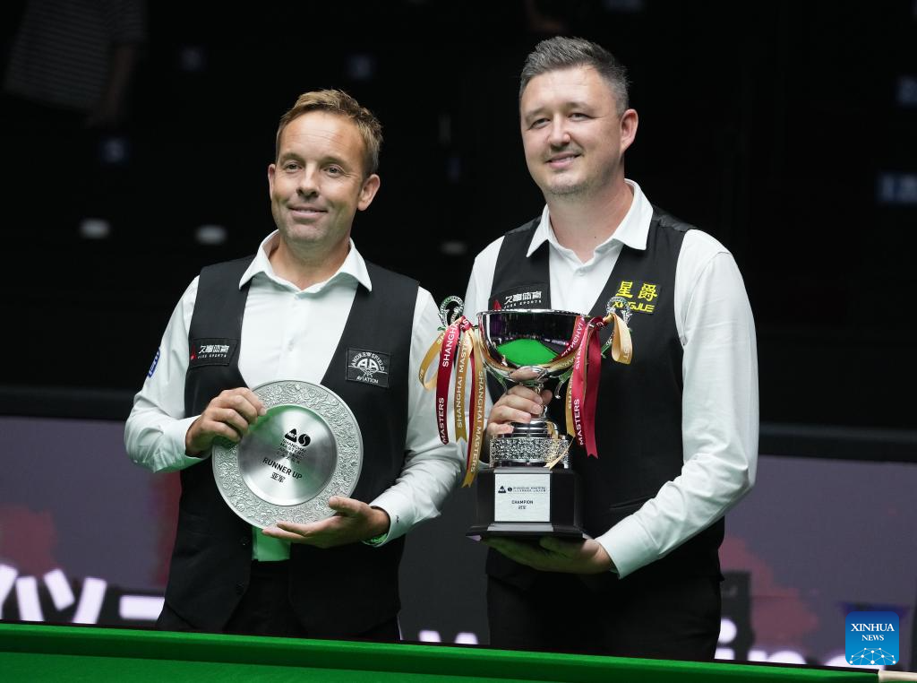 Kyren Wilson (R) and Ali Carter of England pose during the awarding ceremony after the final match between Ali Carter of England and Kyren Wilson of England at the World Snooker Shanghai Masters 2025 in Shanghai, east China, Aug. 3, 2025. (Xinhua/Ding Ting)