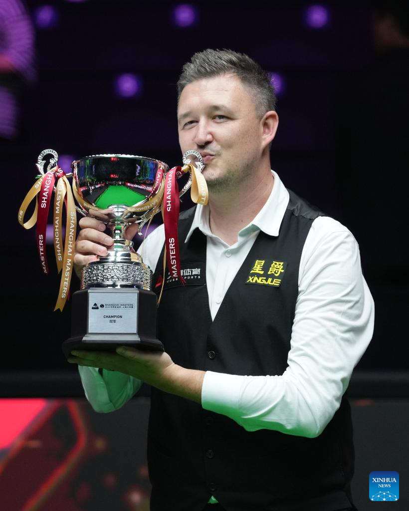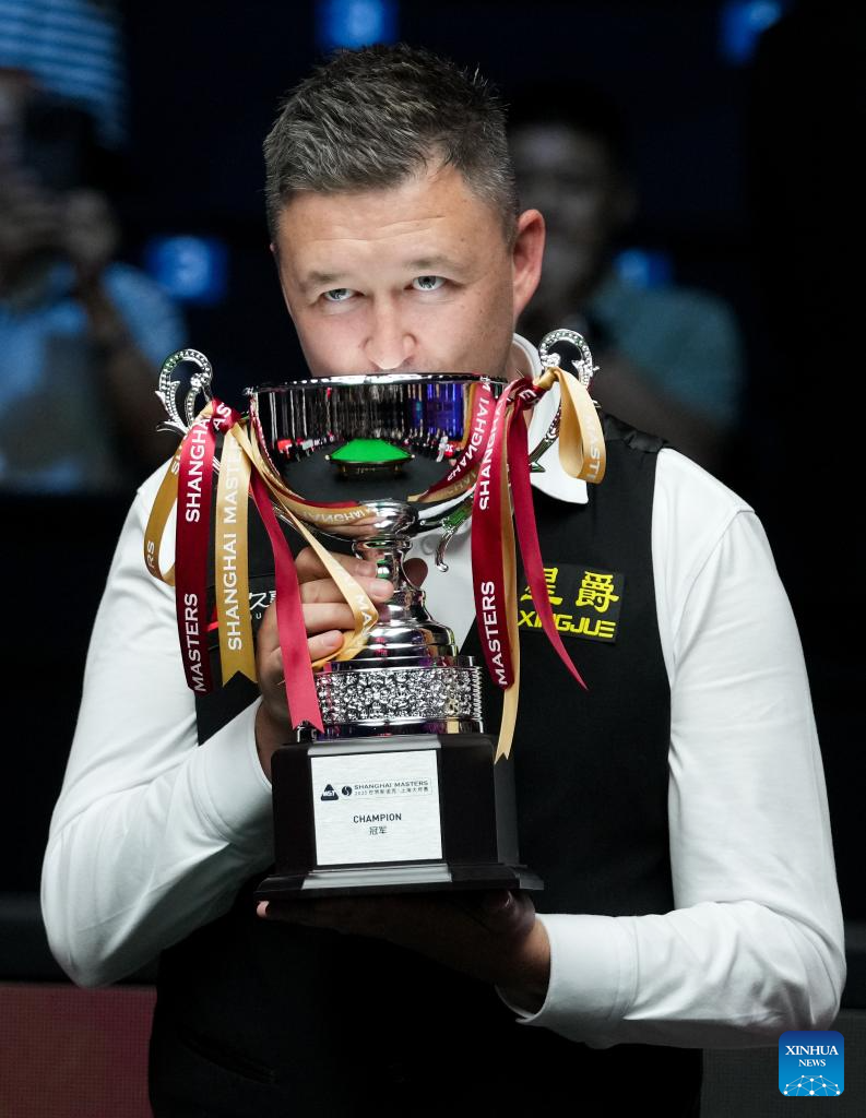 Kyren Wilson of England holds the trophy during the awarding ceremony after the final match between Ali Carter of England and Kyren Wilson of England at the World Snooker Shanghai Masters 2025 in Shanghai, east China, Aug. 3, 2025. (Xinhua/Ding Ting)