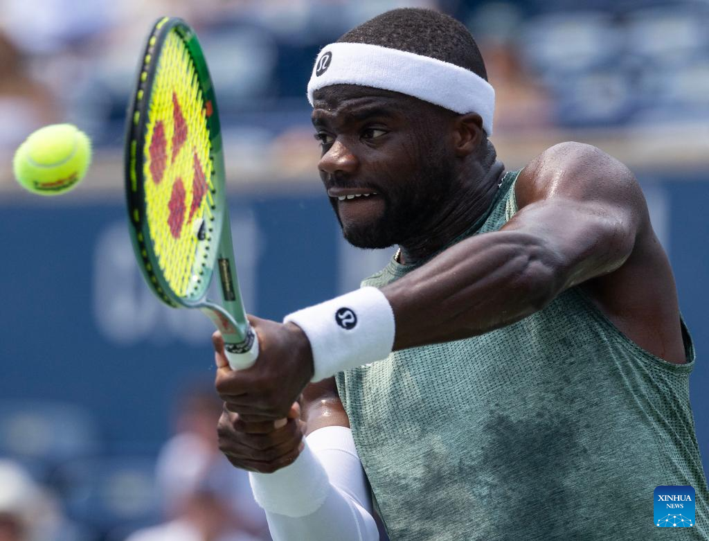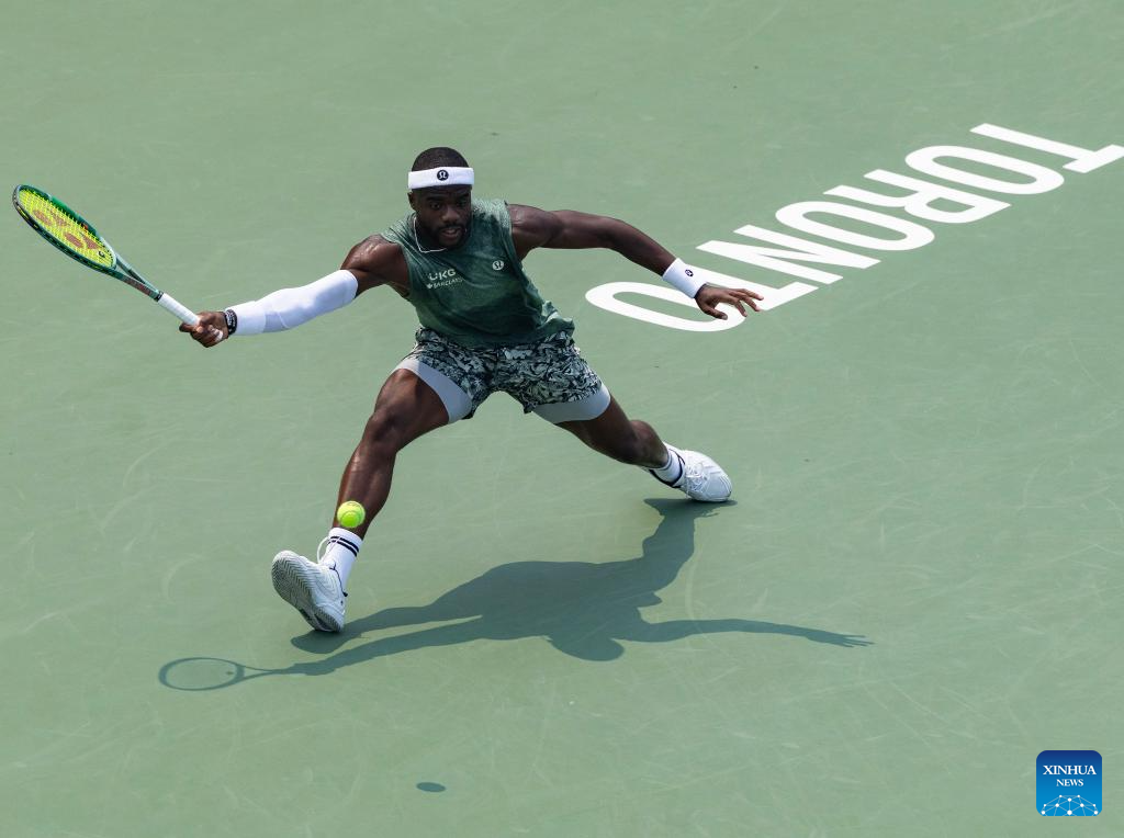 Frances Tiafoe of the United States returns the ball during the men's singles round of 16 match between Frances Tiafoe of the United States and Alex De Minaur of Australia at the 2025 National Bank Open tennis tournament in Toronto, Canada, on Aug. 3, 2025. (Photo by Zou Zheng/Xinhua)