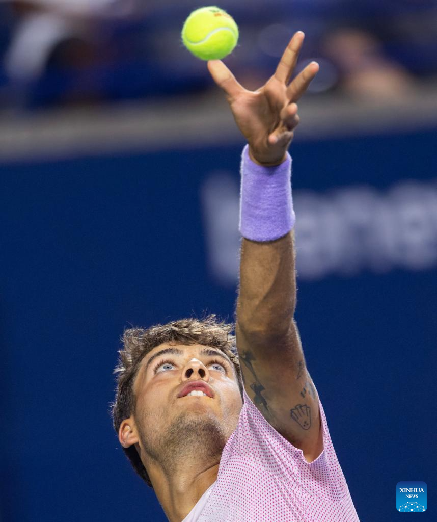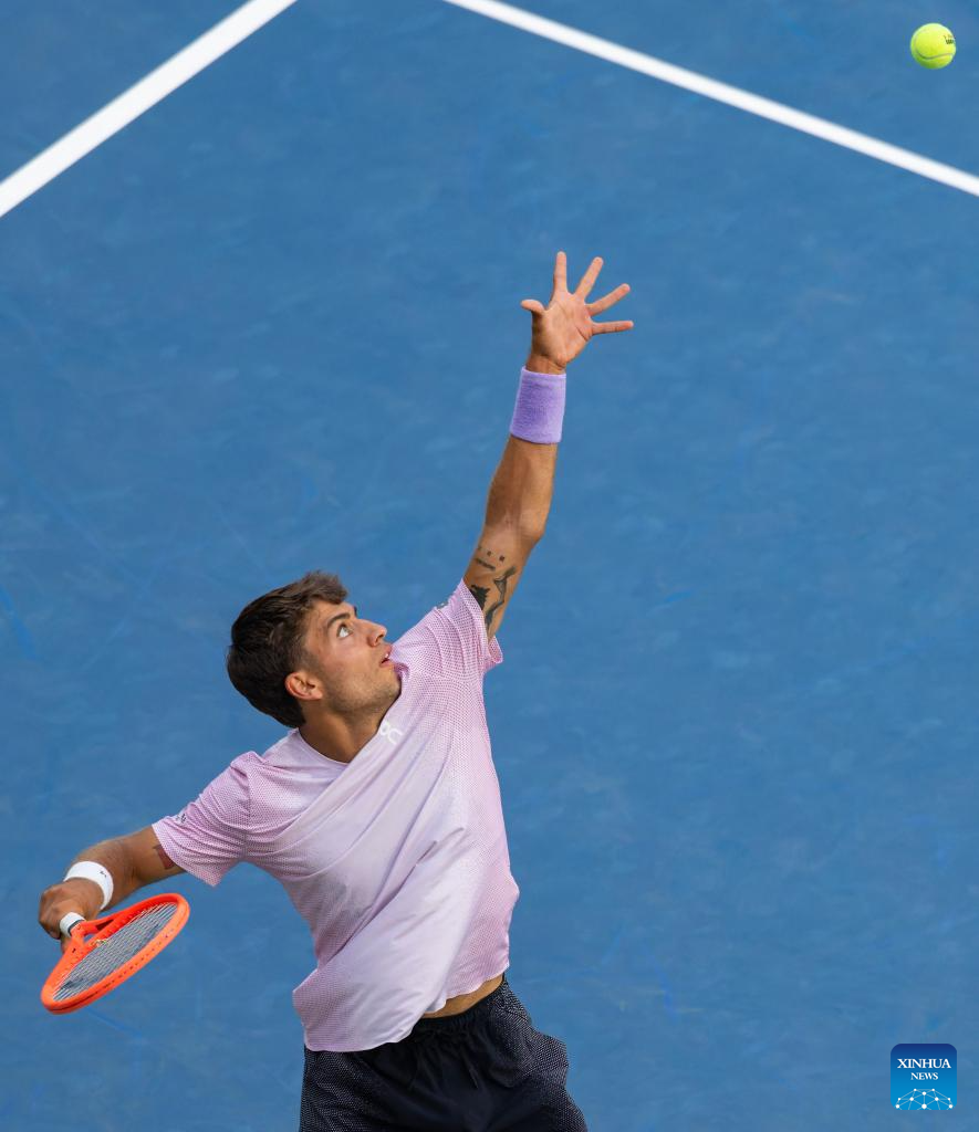 Flavio Cobolli of Italy serves during the men's singles round of 16 match between Flavio Cobolli of Italy and Ben Shelton of the United States at the 2025 National Bank Open tennis tournament in Toronto, Canada, on Aug. 3, 2025. (Photo by Zou Zheng/Xinhua)