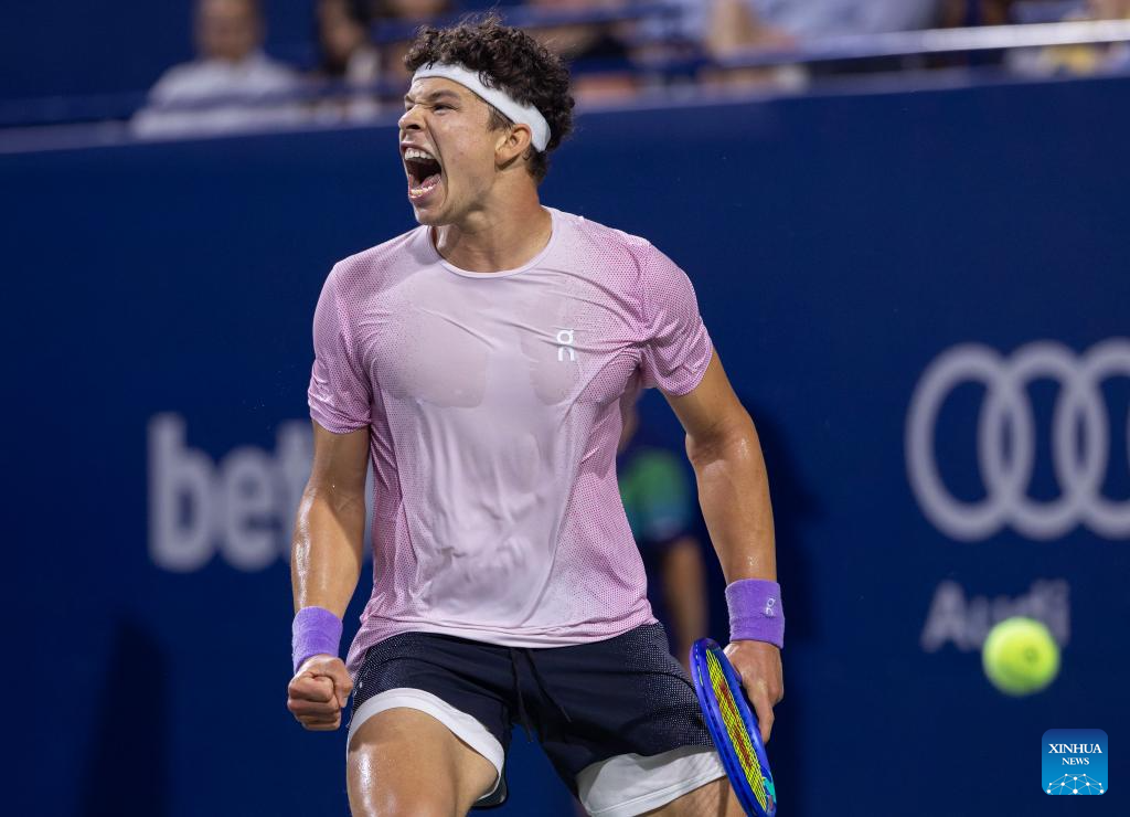 Ben Shelton of the United States celebrates scoring during the men's singles round of 16 match between Flavio Cobolli of Italy and Ben Shelton of the United States at the 2025 National Bank Open tennis tournament in Toronto, Canada, on Aug. 3, 2025. (Photo by Zou Zheng/Xinhua)