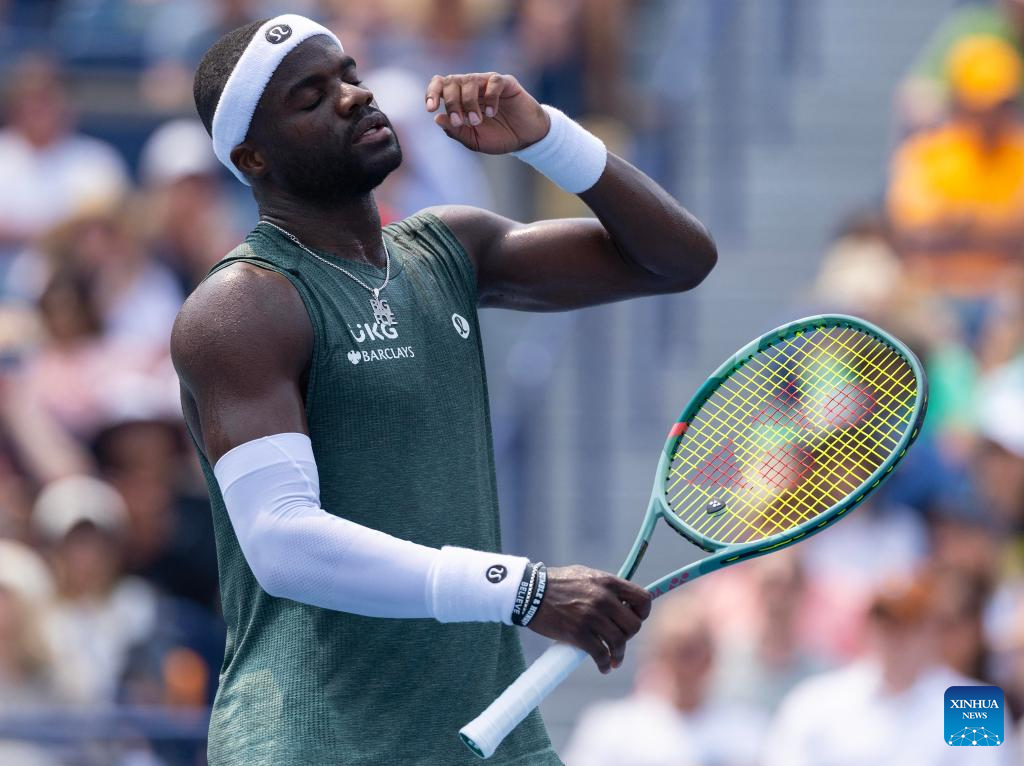 Frances Tiafoe of the United States reacts during the men's singles round of 16 match between Frances Tiafoe of the United States and Alex De Minaur of Australia at the 2025 National Bank Open tennis tournament in Toronto, Canada, on Aug. 3, 2025. (Photo by Zou Zheng/Xinhua)