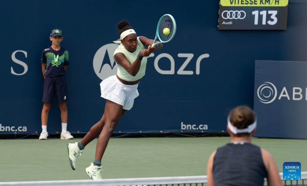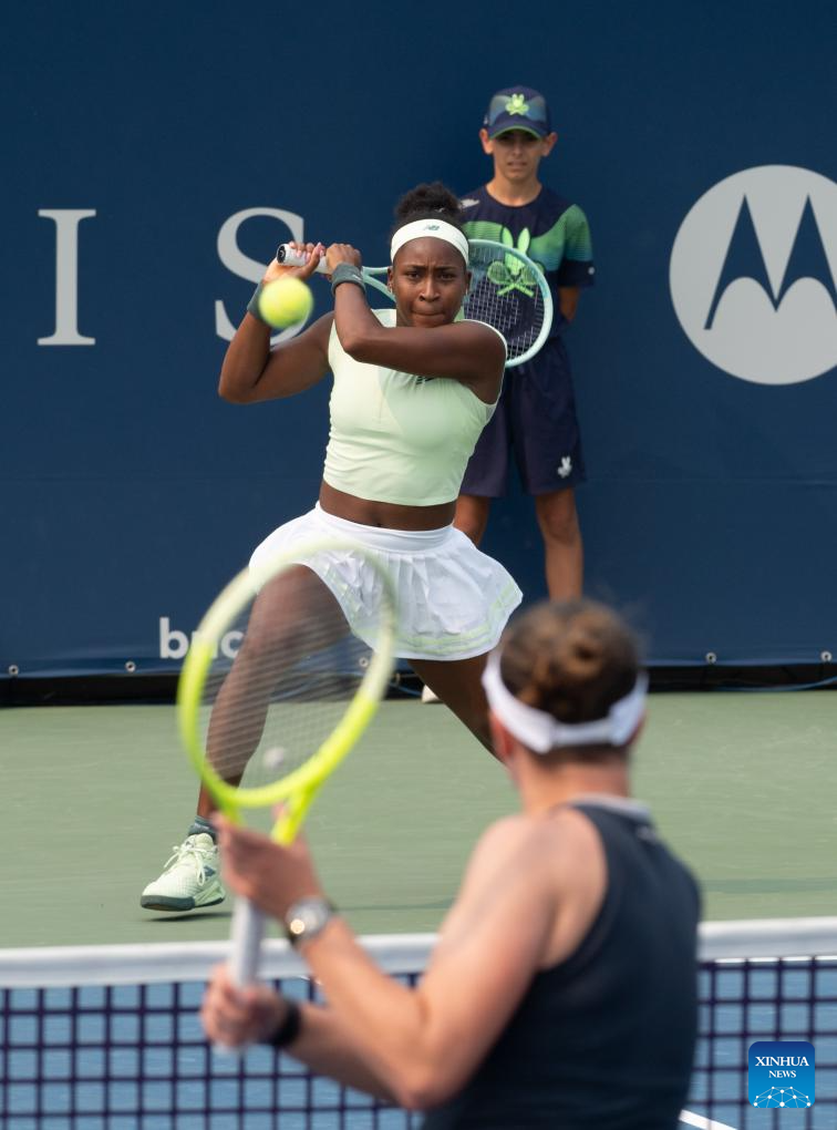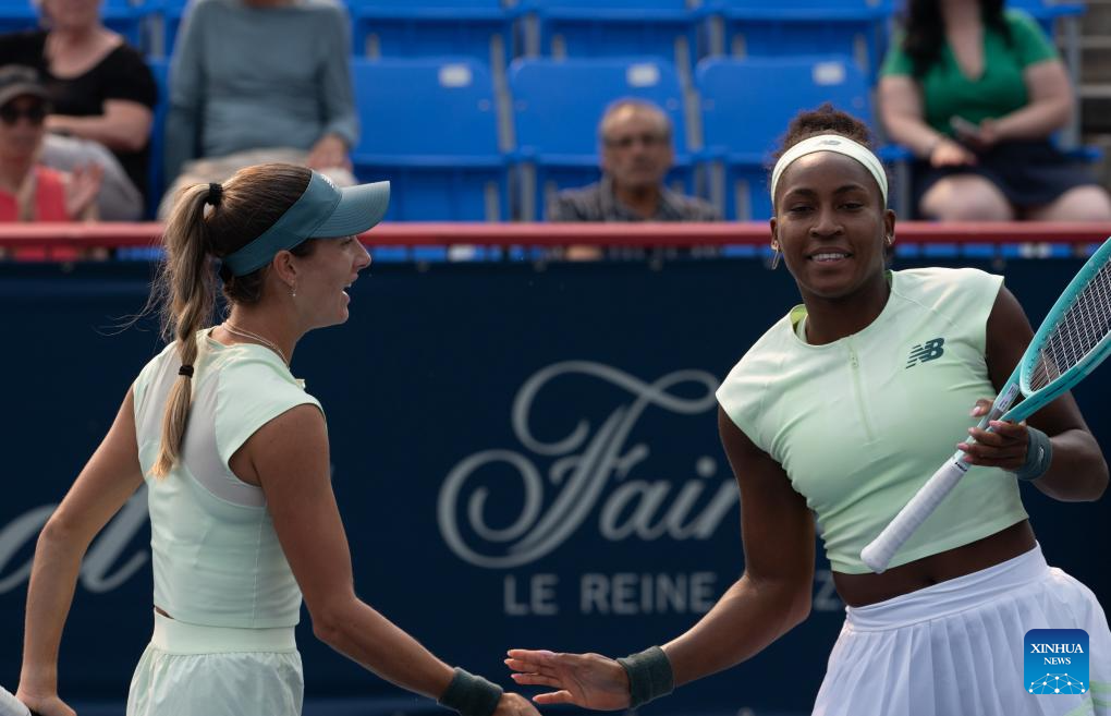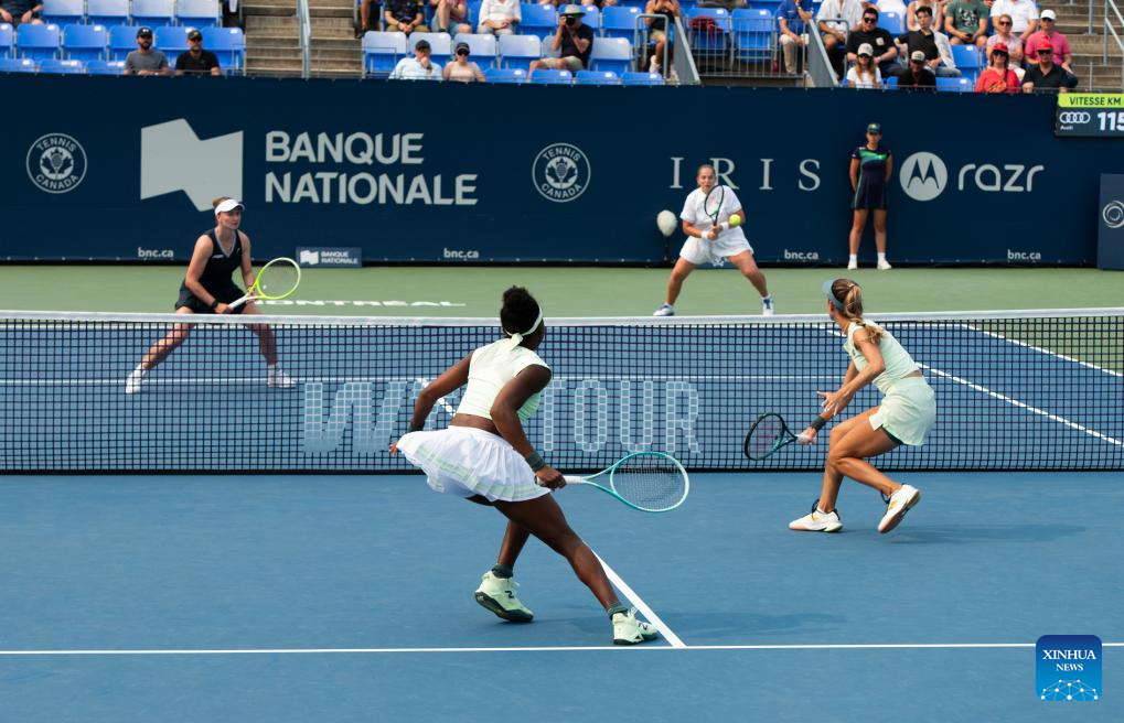 Coco Gauff (C) competes during the women's doubles quarter-final match between Coco Gauff/McCartney Kessler of the United States and Barbora Krejcikova (Czech Republic)/Jelena Ostapenko (Latvia) at the 2025 National Bank Open tennis tournament in Montreal, Canada, Aug 3, 2025. (Photo by Li Haitao/Xinhua)