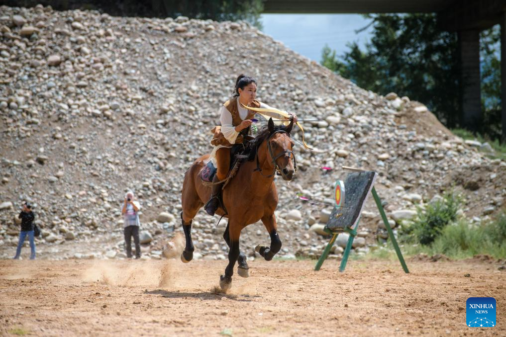 People participate in an archery performance during a folk arts festival at the south bank of the Issyk-Kul Lake, Kyrgyzstan, Aug. 2, 2025. (Xinhua)