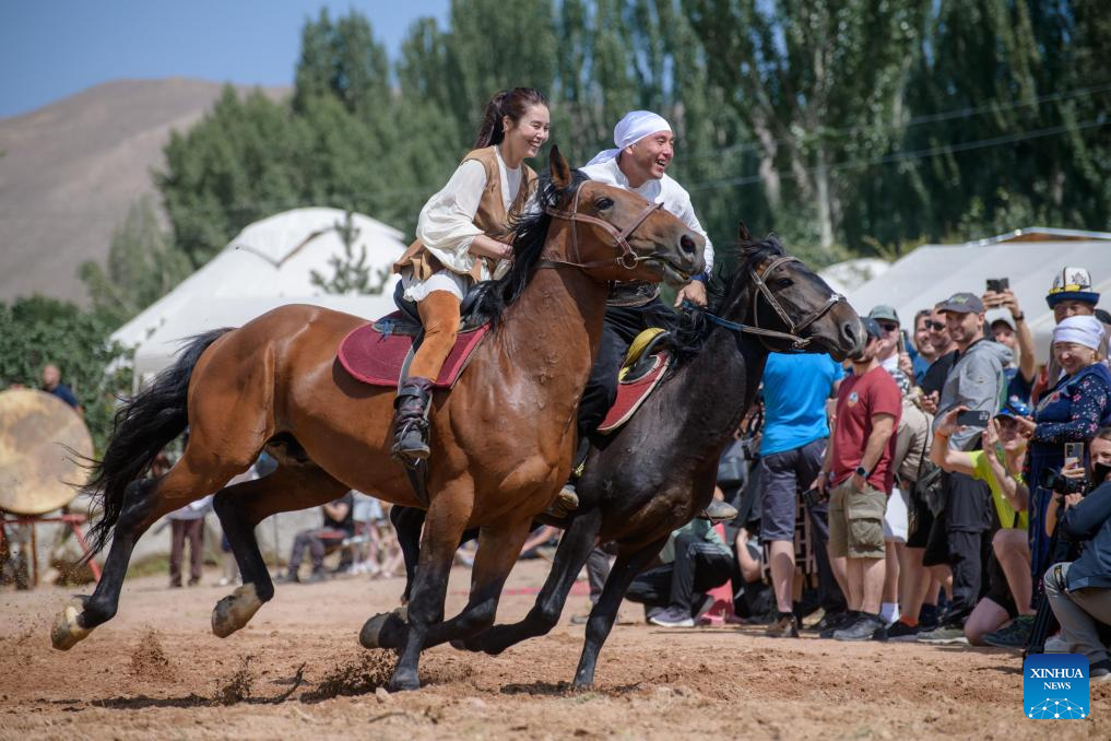 People participate in an equestrianism performance during a folk arts festival at the south bank of the Issyk-Kul Lake, Kyrgyzstan, Aug. 2, 2025. (Xinhua)