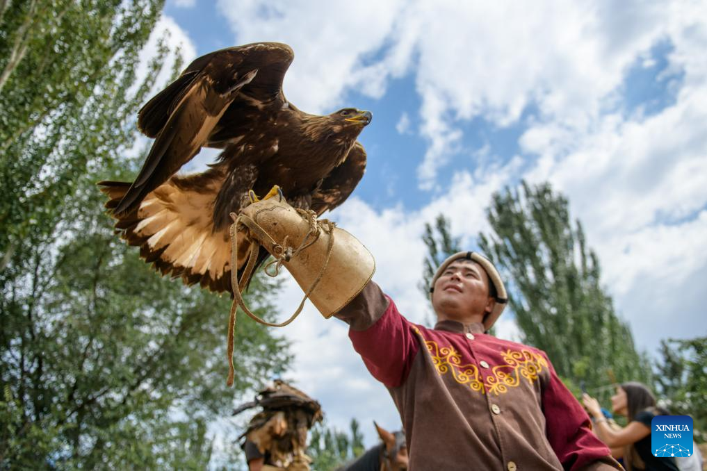 People participate in a hunting performance during a folk arts festival at the south bank of the Issyk-Kul Lake, Kyrgyzstan, Aug. 2, 2025. (Xinhua)