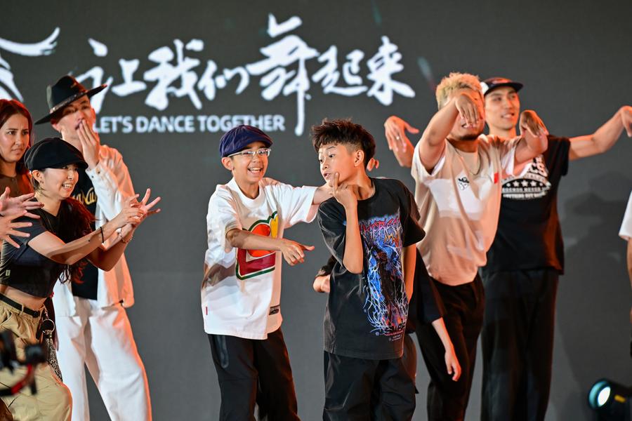 Dancers showcase a dance battle during a street dance show in Karamay, northwest China's Xinjiang Uygur Autonomous Region, Aug. 3, 2025. (Xinhua/Ding Lei)