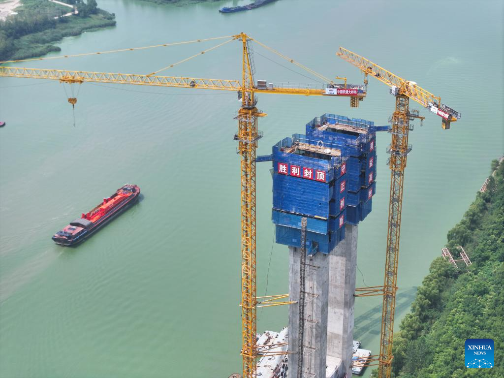 An aerial drone photo taken on Aug. 5, 2025 shows the construction site of a cable-stayed bridge across the Beijing-Hangzhou Grand Canal in Yangzhou, east China's Jiangsu Province, Aug. 5, 2025. The main tower of the bridge witnessed its topping-out on Tuesday. The bridge, with a total length of 564.3 meters, is a key project along the Shanghai-Chongqing-Chengdu High-speed Railway. (Xinhua/Ji Chunpeng)