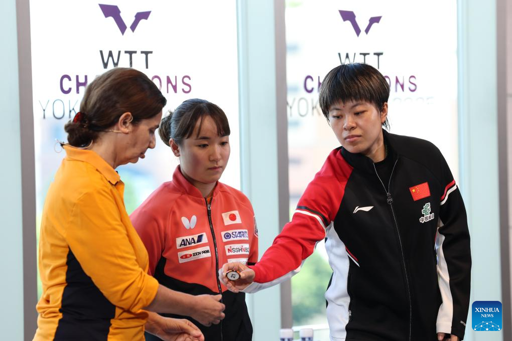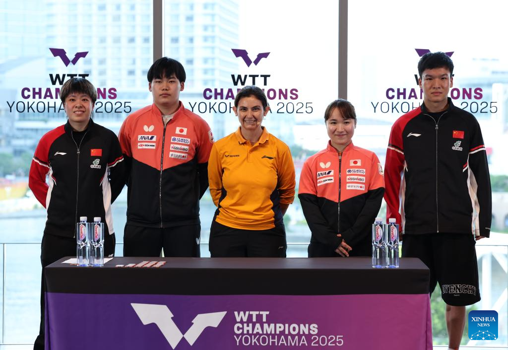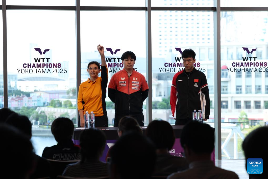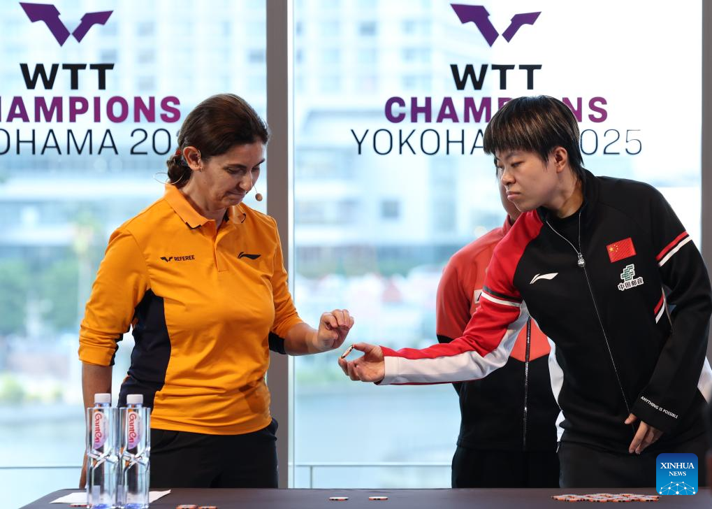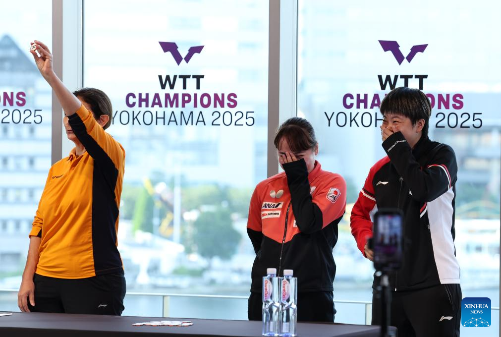 Wang Yidi (R) of China takes part in the draw ceremony for the 2025 WTT Champions Yokohama in Yokohama, Japan, Aug. 5, 2025. (Xinhua/Yue Chenxing)