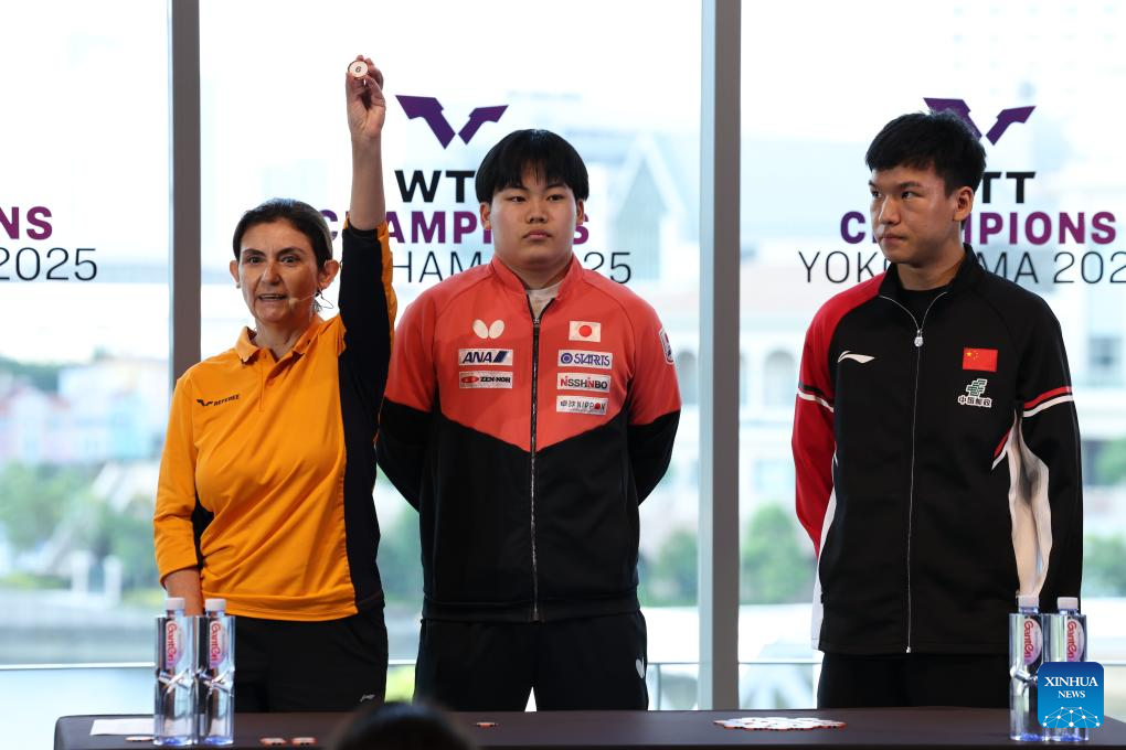 Xiang Peng (L) of China and Matsushima Sora of Japan take part in the draw ceremony for the 2025 WTT Champions Yokohama in Yokohama, Japan, Aug. 5, 2025. (Xinhua/Yue Chenxing)
