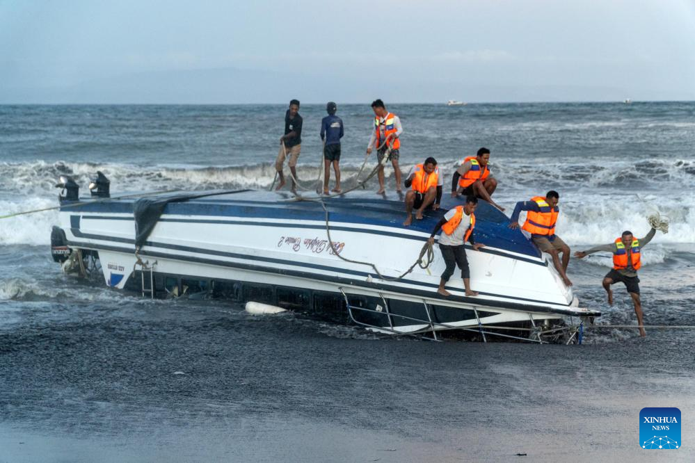 People and officers release rope after pulling the capsized fast boat to the sea shore at Sanur beach in Bali, Indonesia, Aug. 5, 2025. Two people were killed and another went missing after a fast boat sank in waters off Indonesia's Bali Island on Tuesday, according to I Nyoman Sidakarya, head of the island's Search and Rescue Office. (Photo by Dicky Bisinglasi/Xinhua)