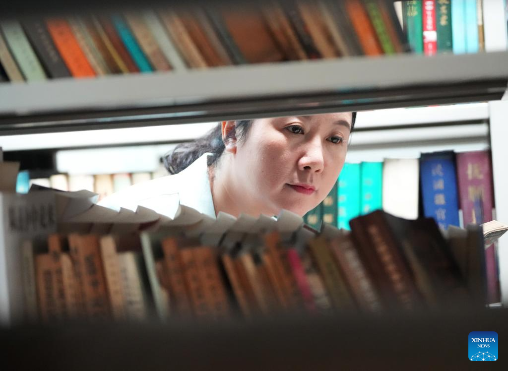 Shi Renhua looks for files at the 9.18 Historical Museum in Shenyang, northeast China's Liaoning Province, July 28, 2025. Shi Renhua, head of public education service at the 9.18 Historical Museum in Shenyang, has devoted herself into study of historical documents as well as editorial projects since she joined the museum in 1999.