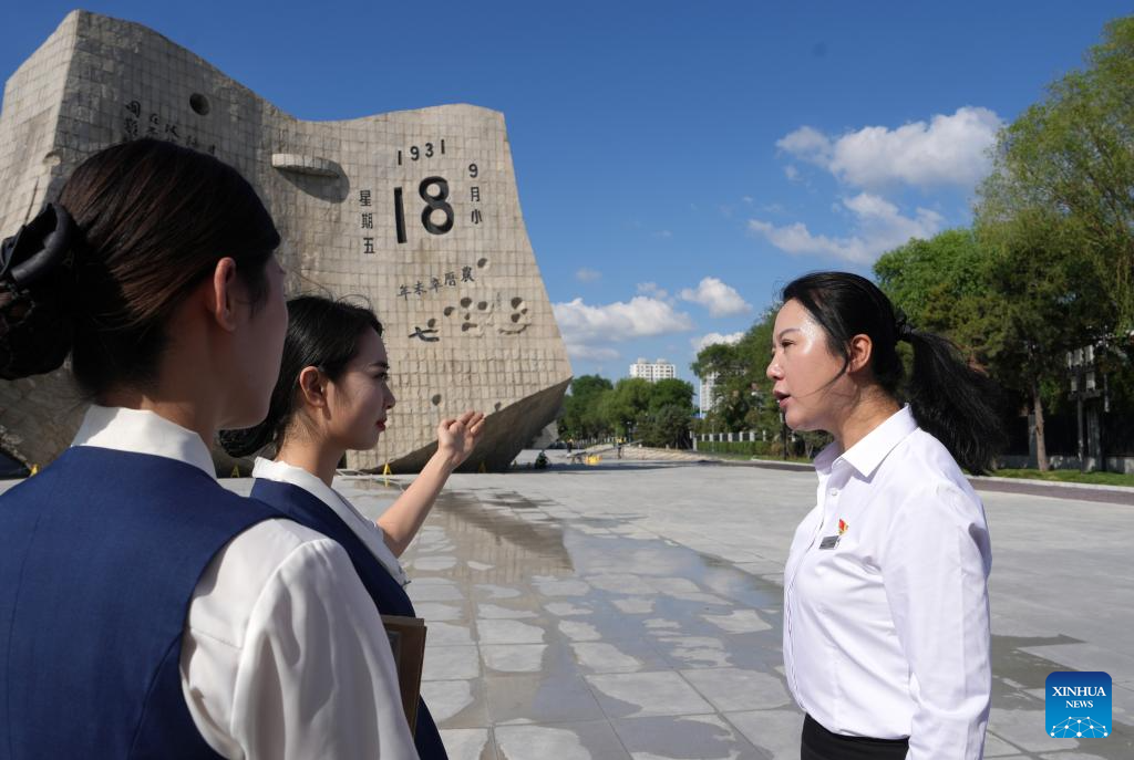 Shi Renhua (1st R) discusses with her colleagues on improvement in docent service at the 9.18 Historical Museum in Shenyang, northeast China's Liaoning Province, Aug. 4, 2025. Shi Renhua, head of public education service at the 9.18 Historical Museum in Shenyang, has devoted herself into study of historical documents as well as editorial projects since she joined the museum in 1999.