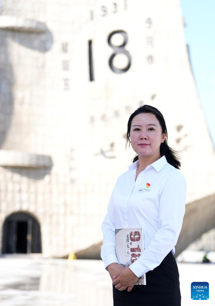 Shi Renhua poses for a photo at the 9.18 Historical Museum in Shenyang, northeast China's Liaoning Province, Aug. 4, 2025. Shi Renhua, head of public education service at the 9.18 Historical Museum in Shenyang, has devoted herself into study of historical documents as well as editorial projects since she joined the museum in 1999.
