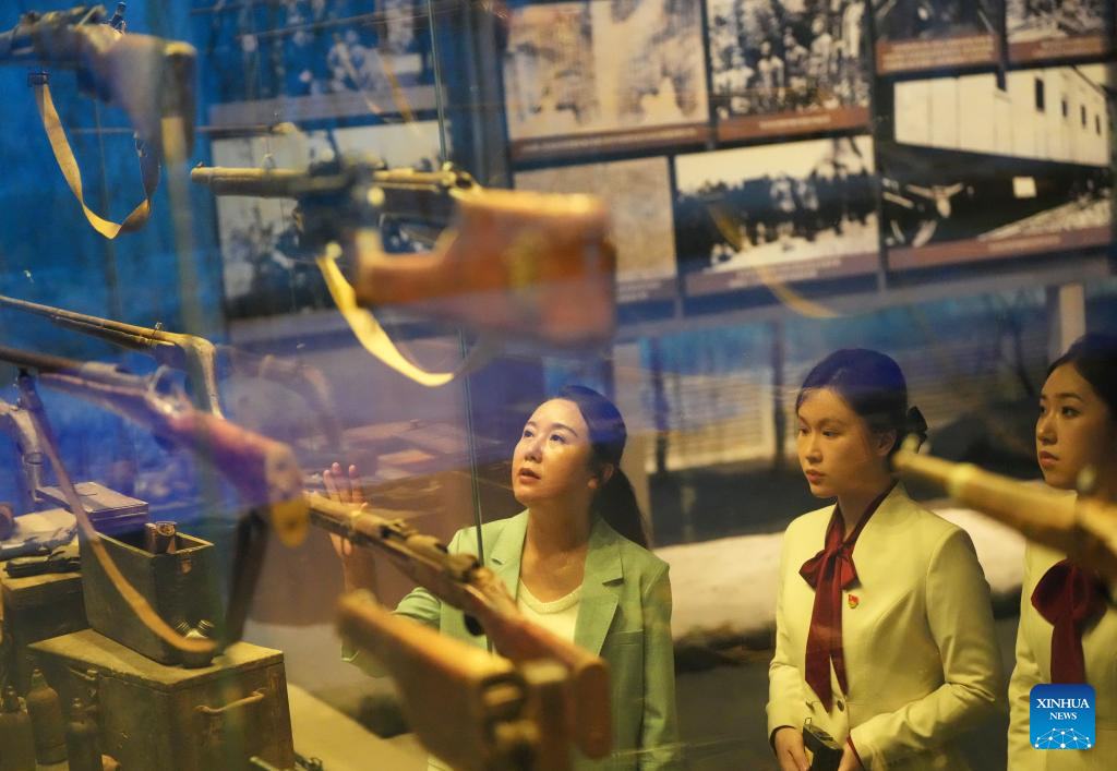 Shi Renhua (1st L) and her colleagues check exhibits at the 9.18 Historical Museum in Shenyang, northeast China's Liaoning Province, July 28, 2025. Shi Renhua, head of public education service at the 9.18 Historical Museum in Shenyang, has devoted herself into study of historical documents as well as editorial projects since she joined the museum in 1999.