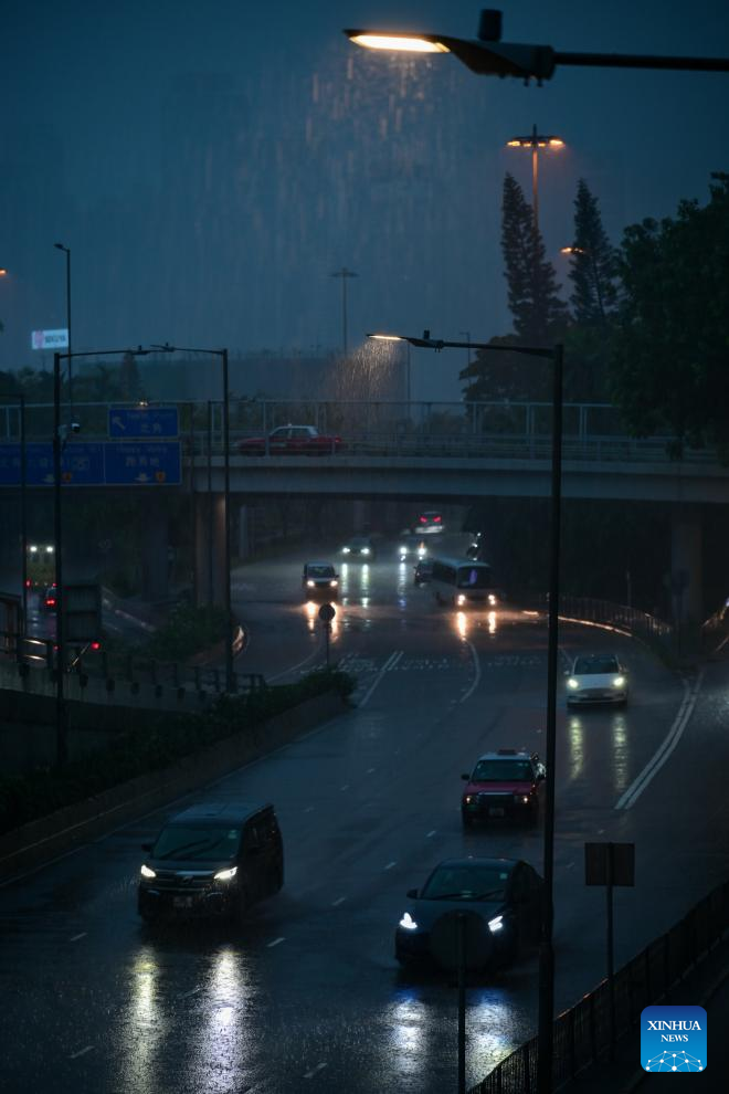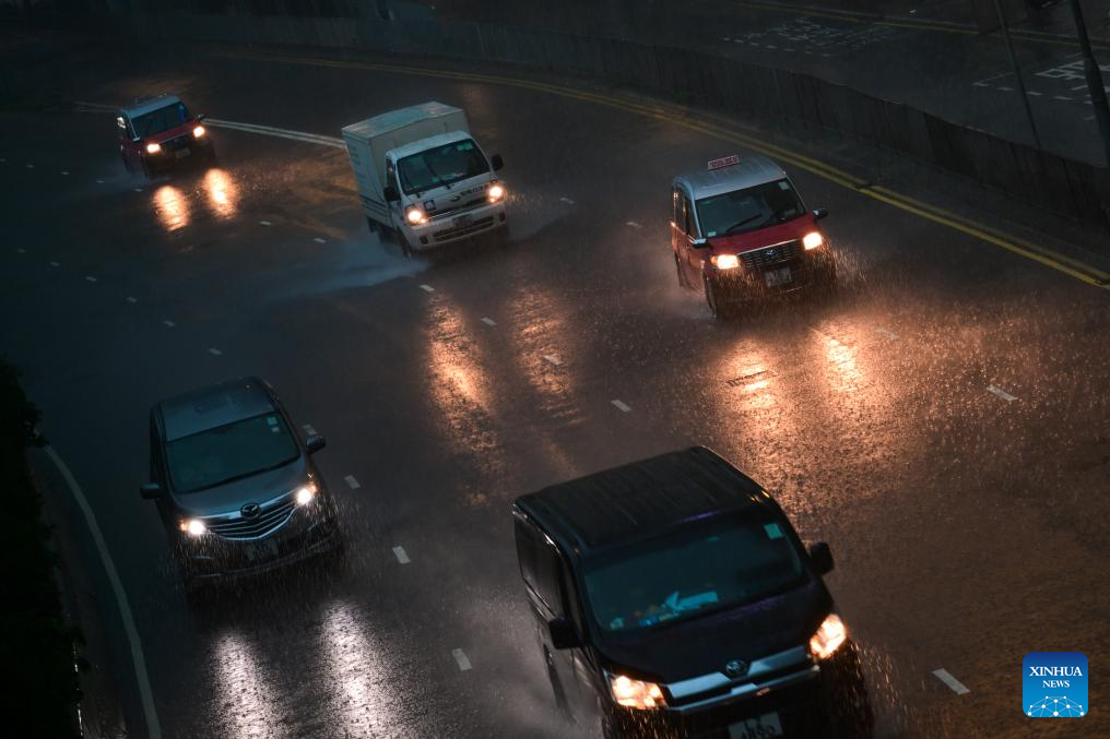 Cars drive amid rains on a street in Hong Kong, south China, Aug. 5, 2025. The Hong Kong Observatory on Tuesday morning issued the black rainstorm warning signal, the fourth time within eight days. This is the highest level in the observatory's three-tier heavy rain alert system. This indicates that heavy rain has fallen or is expected to fall generally over Hong Kong, exceeding 70 mm in an hour, and is likely to continue. (Xinhua/Zhu Wei)