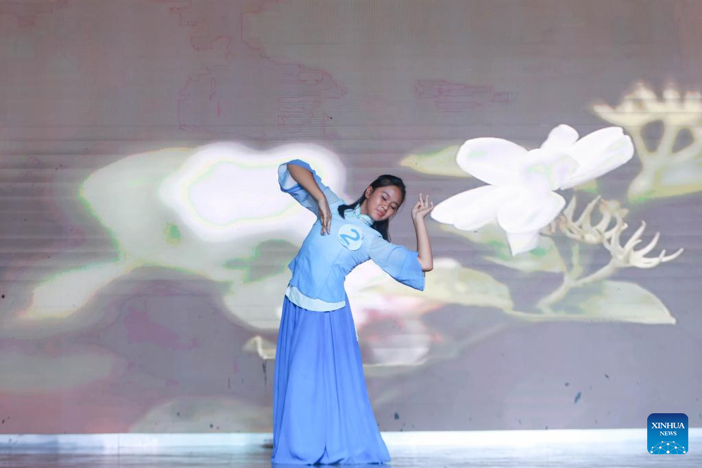 A contestant performs during the 11th Chinese culture talent competition for Nepali students in Kathmandu, Nepal, on Aug. 5, 2025. The 11th Chinese culture talent competition for Nepali students was held here on Tuesday. Nearly 300 contestants demonstrated their talents through 10 Chinese songs and 10 Chinese modern and classic dances, drawing a frequent outburst of cheers and applause from the audience. (Photo by Sulav Shrestha/Xinhua)