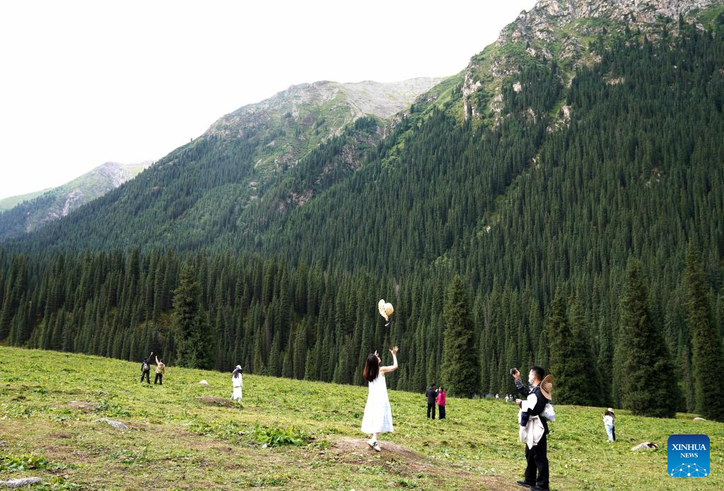 Tourists visit Xiata scenic area in Zhaosu County of Ili Kazak Autonomous Prefecture, northwest China's Xinjiang Uygur Autonomous Region, July 30, 2025. Ili Kazak Autonomous Prefecture has ushered in its peak tourism period. The region's unique natural landscapes and cultural sites have attracted a large number of visitors. It received 54.93 million domestic tourists in the first seven months of this year, a year-on-year increase of 10.31 percent. (Xinhua/Zhao Yusi)